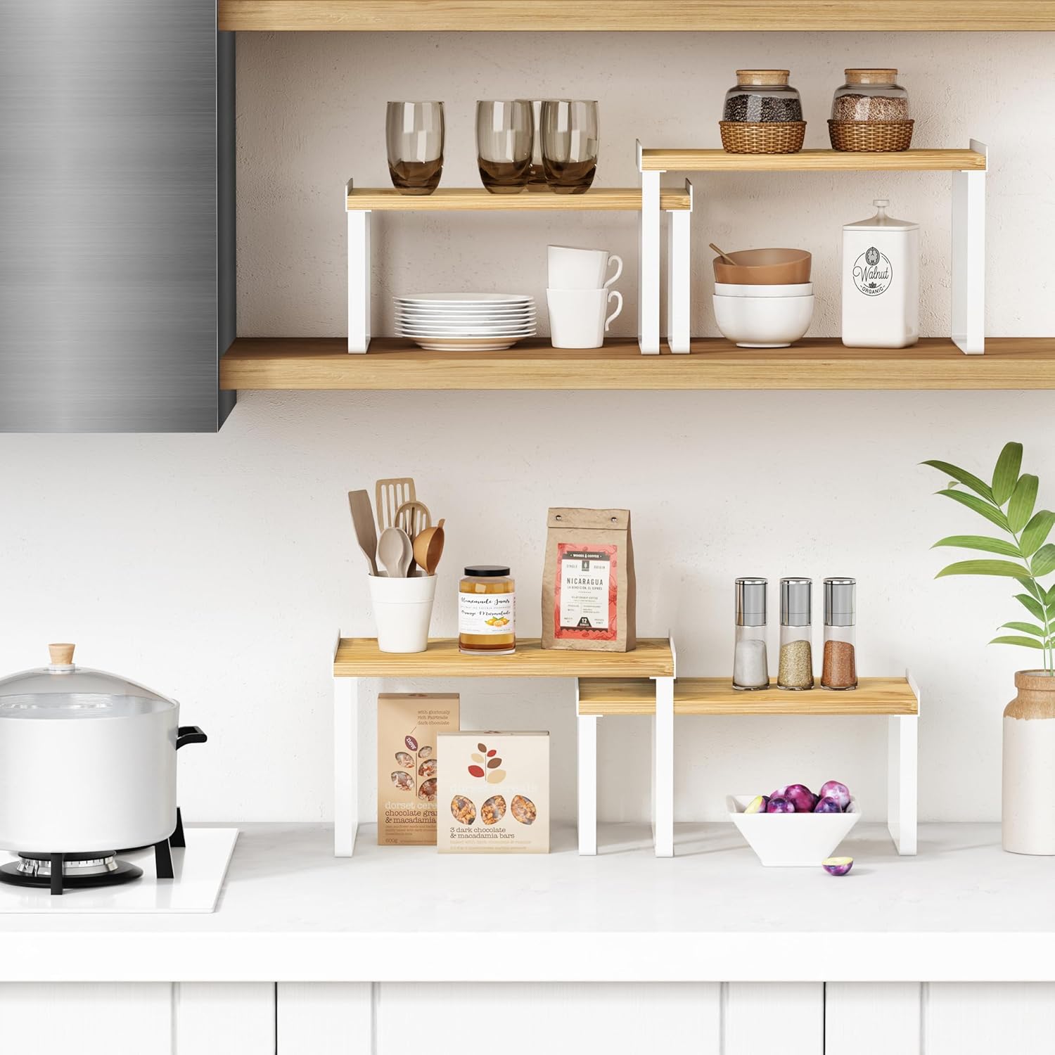 Kitchen Cabinet Organizer Set of 4, Desk Shelf Riser, Stackable Cabinet Pantry Cupboard Organizer, Kitchen Counter top Shelf, Storage Rack for Spices, Plates, Bamboo Wood, White