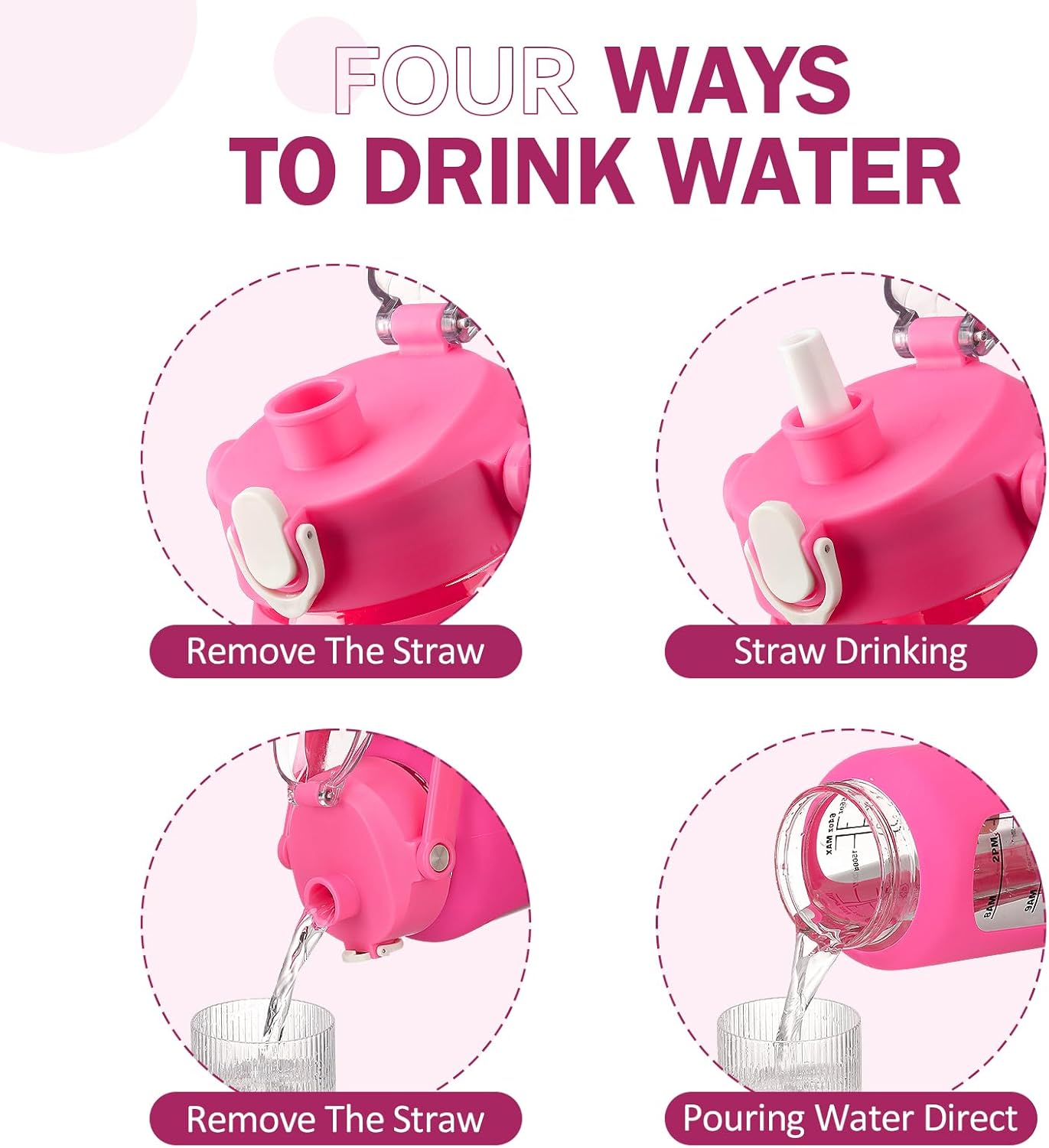 - ❤Glass Water Bottle with Pop-up Straw Lid- Our 64oz water bottle with straw is designed with an upgraded lid that ensures 100% leakproof and dustproof. Advanced one-click button makes you drink easier, just push the button and the straw will pop out automatically.