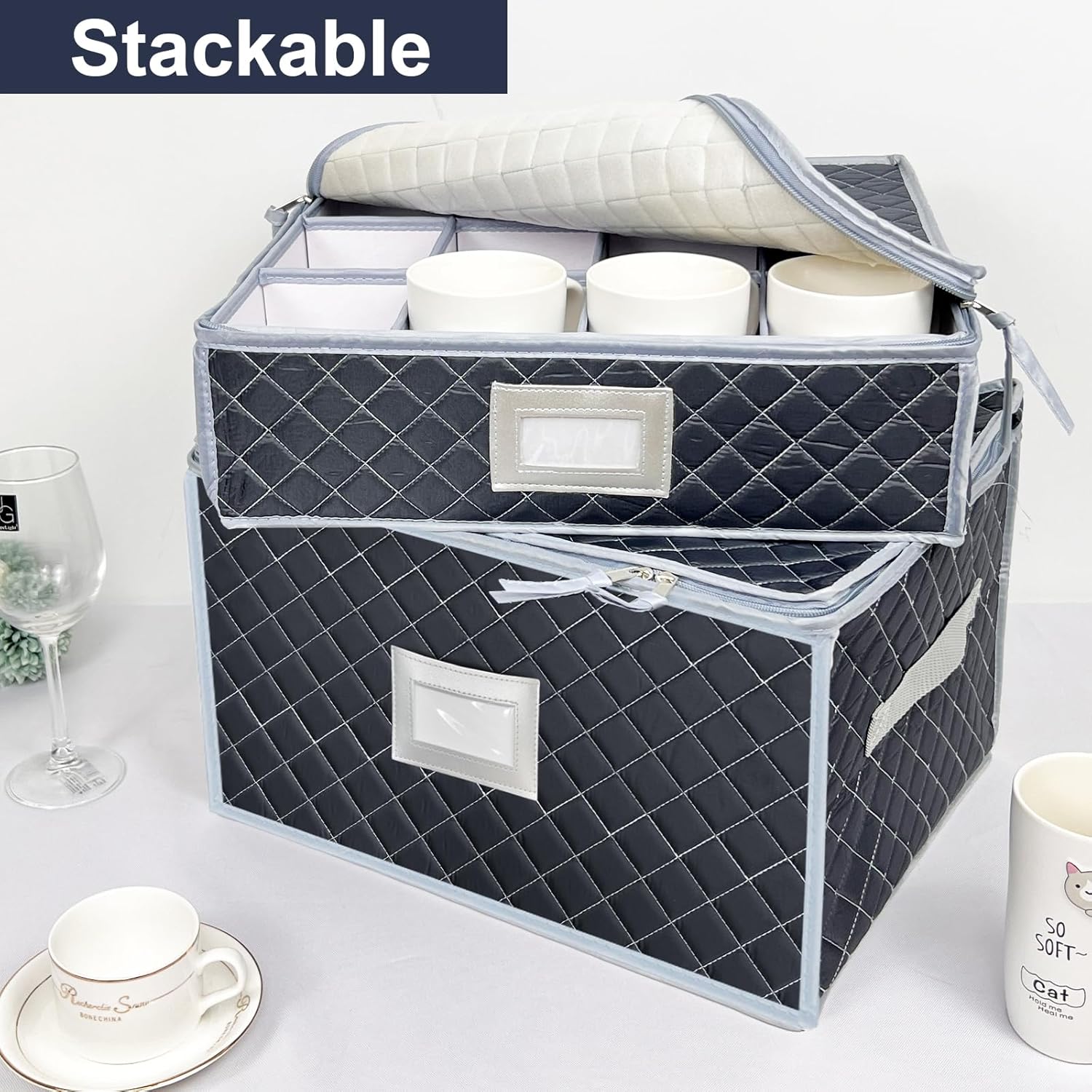 Wine Glass and Mug Storage Box with Dividers - 2 Pack China Storage Containers Set Holds 24 Glassware , Stemware,Coffee Mug and Tea Cup, Organizer Bin with Sturdy Metal Zipper,Label and Handles (Grey)