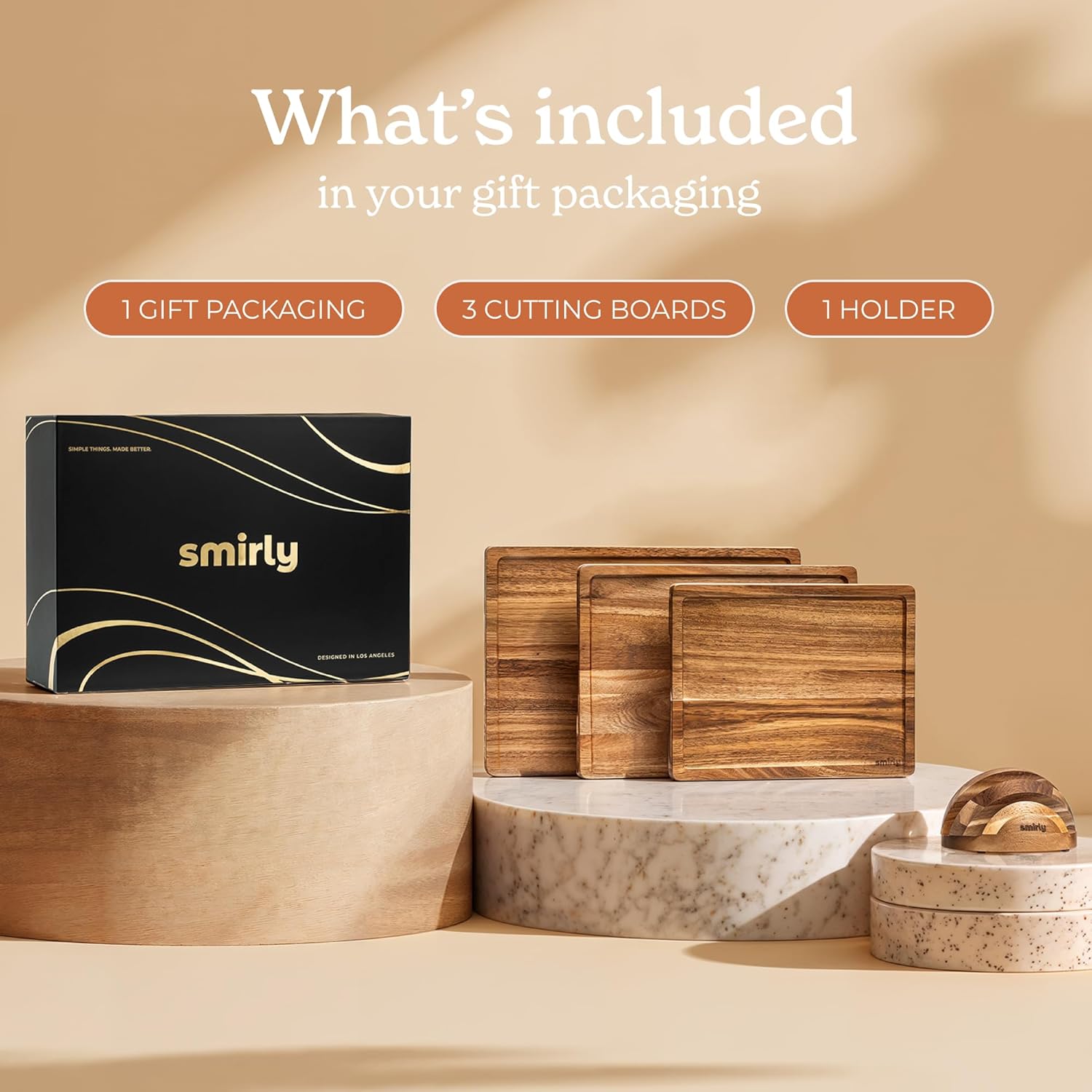- 3-Pack with Holder for Organized Convenience - Keep your kitchen tidy with our 3-pack cutting board set featuring a convenient holder. This set not only provides three versatile acacia boards but also a stylish holder to keep them organized and accessible.