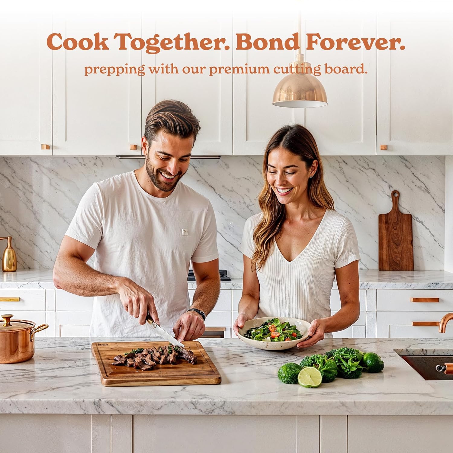 - Less Work and No Worries - Juice grooves on our wood cutting board catch excess liquid, protecting your counters. Ergonomic handles make it easy to grip, while v cutting boards for kitchen resist nicks, ensuring superior sanitation and easy cleaning.