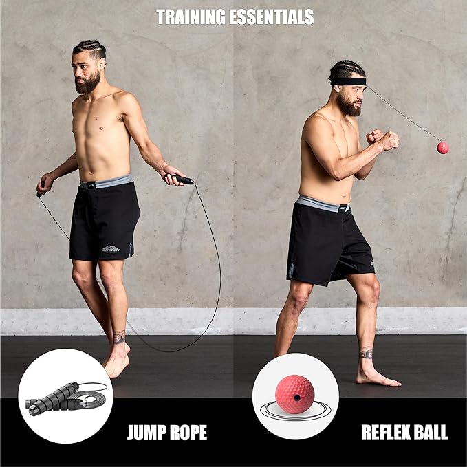- MUAY THAI TRAINING KIT REFLEX BALL SET, SPEED JMUP ROPE: Muay Thai heavy bag for men comes with a muay thai training kit containing muay thai reflex ball, muay thai gloves, & mauy thai socks; muay thai equipment helps train taekwondo kicking bag, karate punching bag, jeet kune do punching bag & stabilize kickboxing heavy bag & provides a cushion when practicing leg strikes heavy kick bag; the PU boxing speed reflex ball set helps with speed & accuracy of punches with muay thai kick boxing bags.