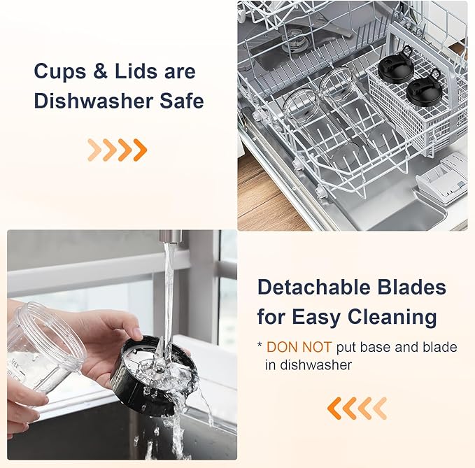 - Safe for Use, Easy to Clean: the electric blender only works when the mixing cup is properly pressed down; Cooling fan on the bottom and the back dissipates heat quickly; Four non-slip silicone pads keep the food blender balanced while working; Cups and lids are dishwasher-safe; 90-day return, 24-month replacement and lifetime technical support