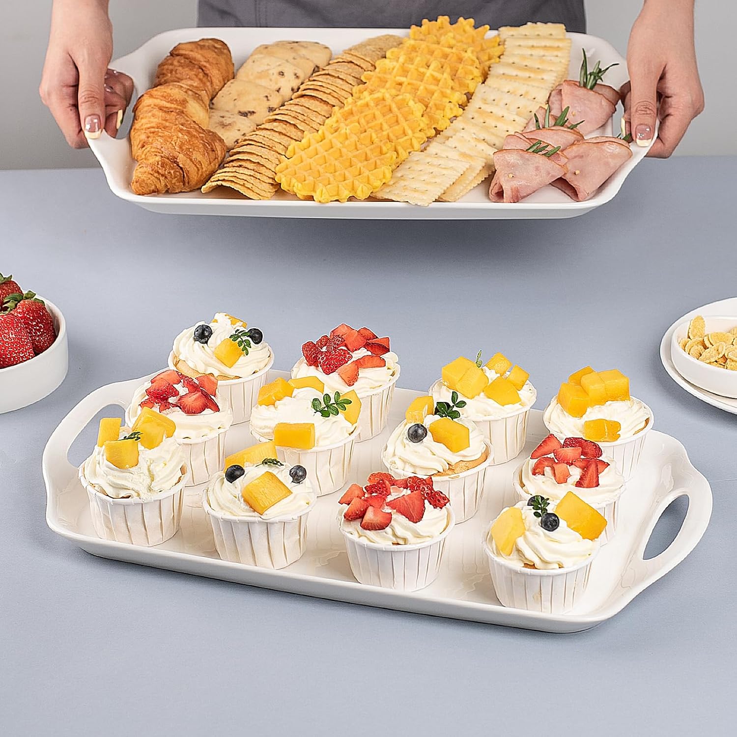 - EASY TO CLEAN & STORE: The serving tray has a smooth surface that does not attract food residue, it can be easily cleaned directly with a mild detergent and sponge and will not scratch or damage the tray. Its rectangular design so it can be stacked for storage, saving space and easy to organize.