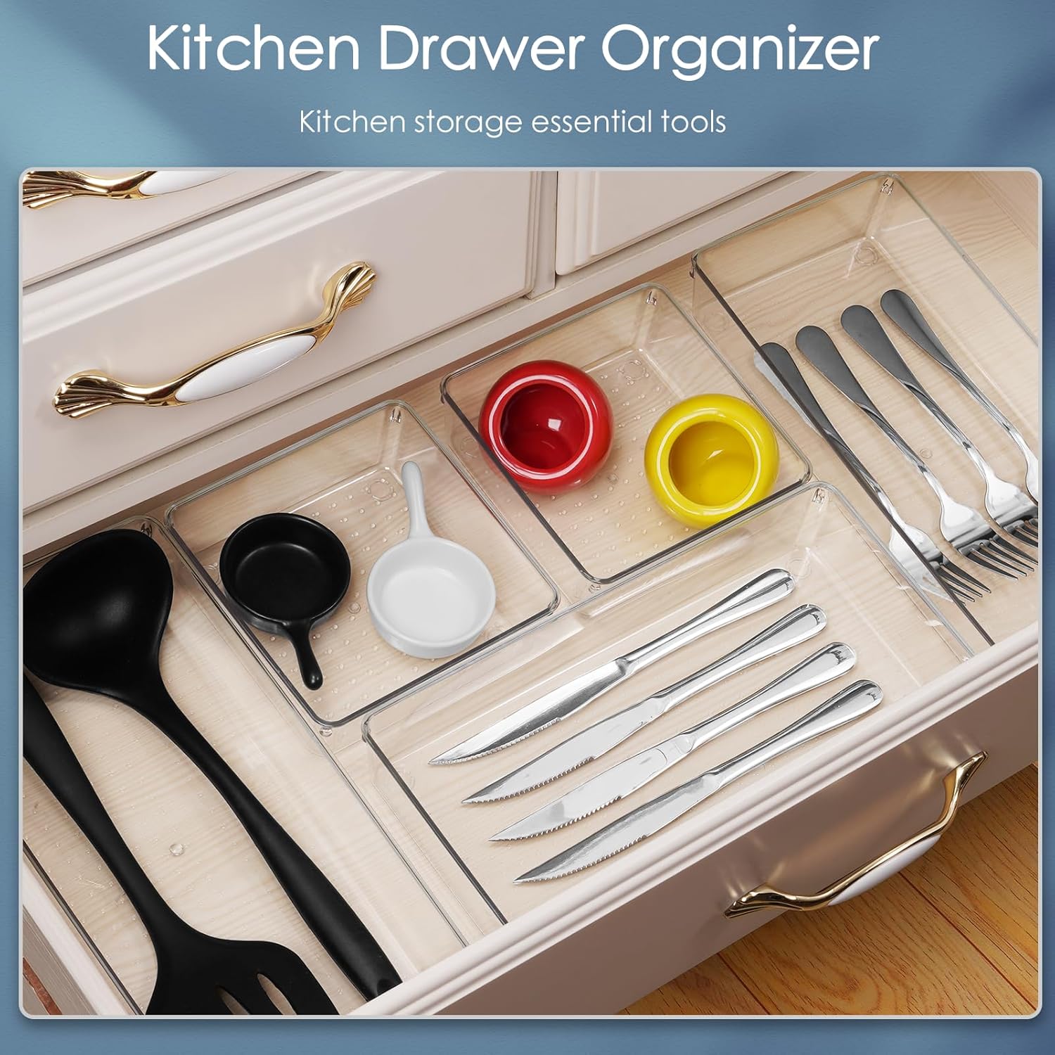 12 Pack Large Clear Plastic Drawer Organizer Set, Acrylic Bathroom Organizer Vanity Trays Dividers, Kitchen Organizers and Storage, Non-Slip Storage Bins for Makeup, Snacks, Office, Desk, Fridge