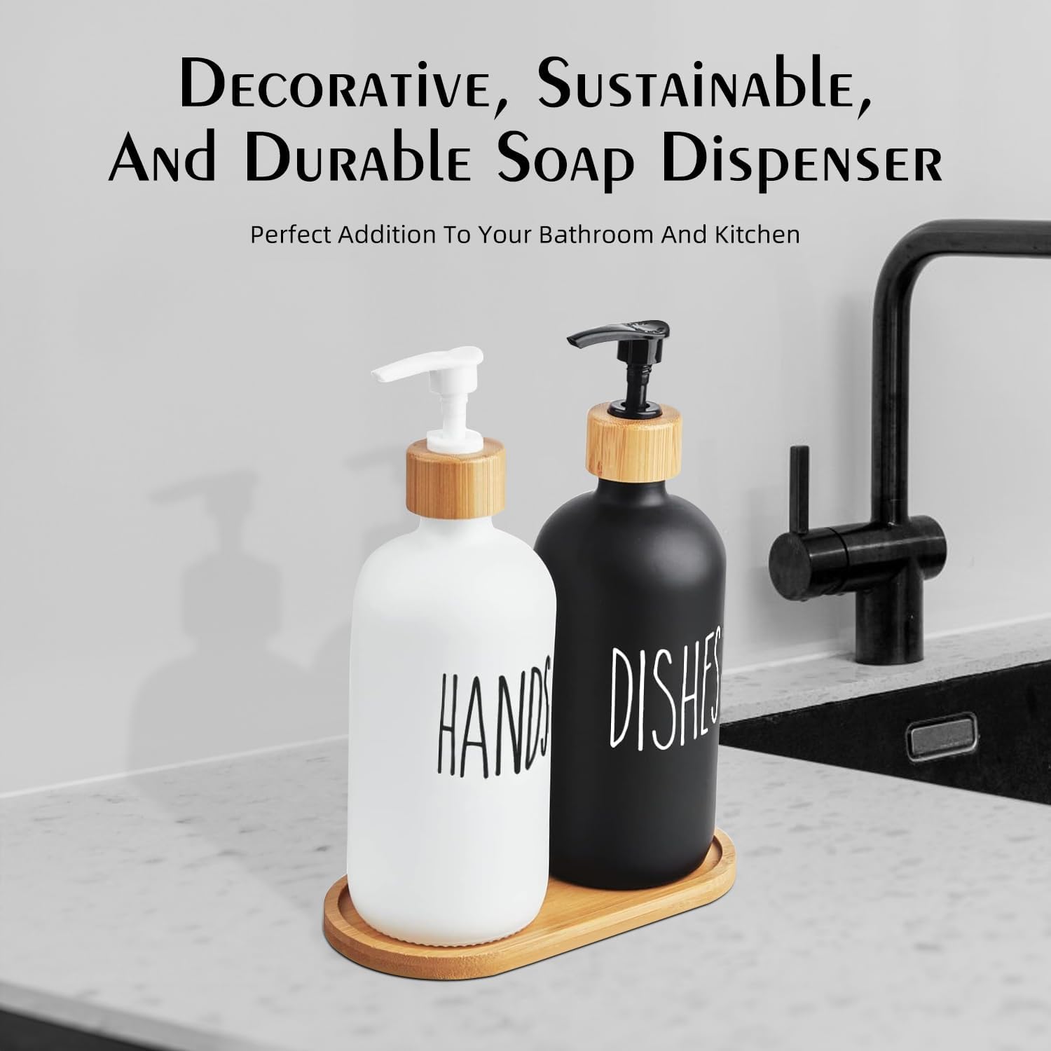 - REFINED SOAP DISPENSER SET - This package includes 2 durable glass bottles and a beautifully crafted artisanal tray. By replacing disposable plastic dispensers, it offers luxurious solution for your kitchen decor