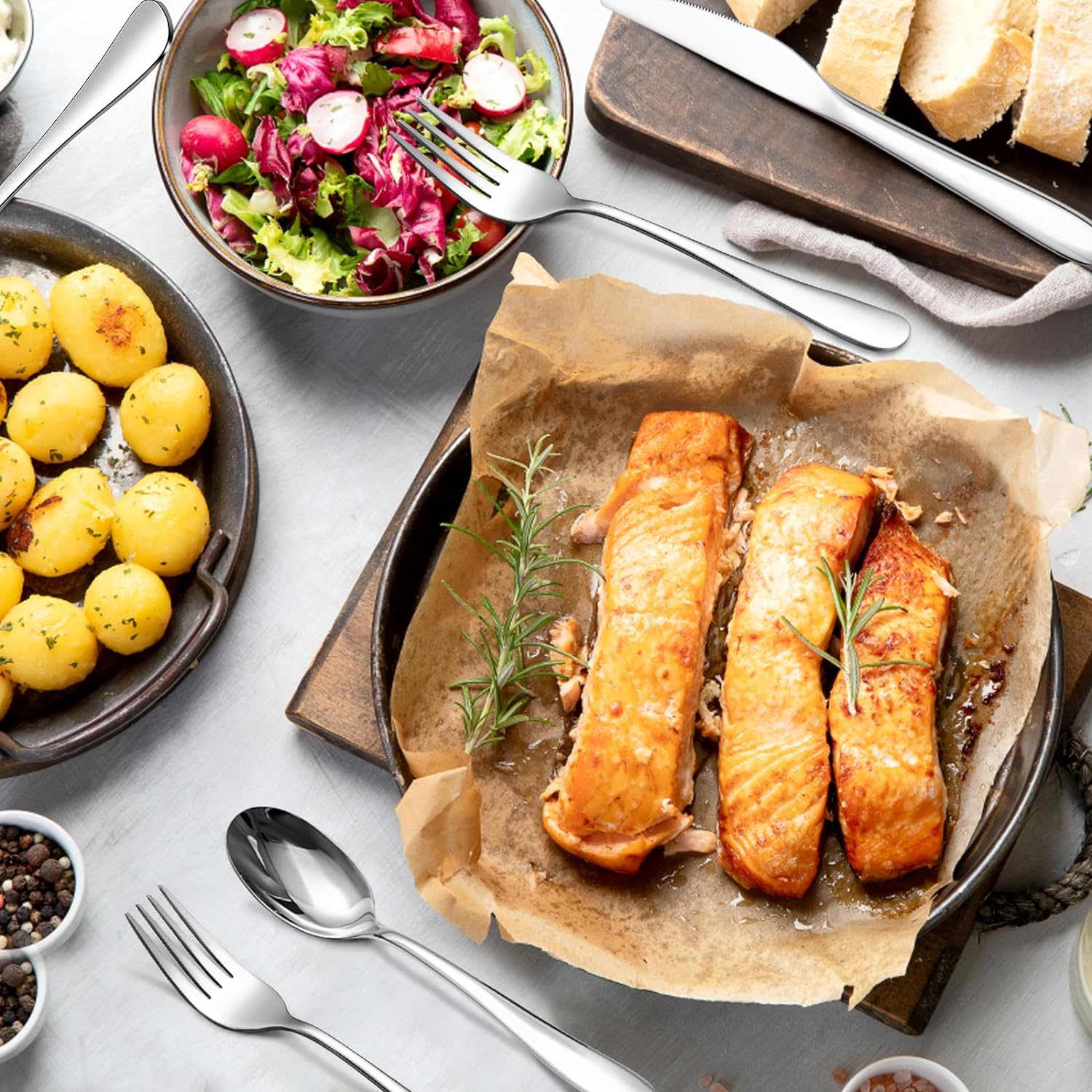 - [Dishwasher Safe]- The total quantity of dinner kinves and dinner forks and dinner spoons is 12. They are all designed ergonomically, which has mirror polished and smooth edges for a comfortable feel. Meanwhile, this kitchen utensil set has a sturdy structure, so it can be used for a long time. Most importantly, the silverware sets are dishwasher safe, so you can just put them in a dishwasher for saving time in hand washing.