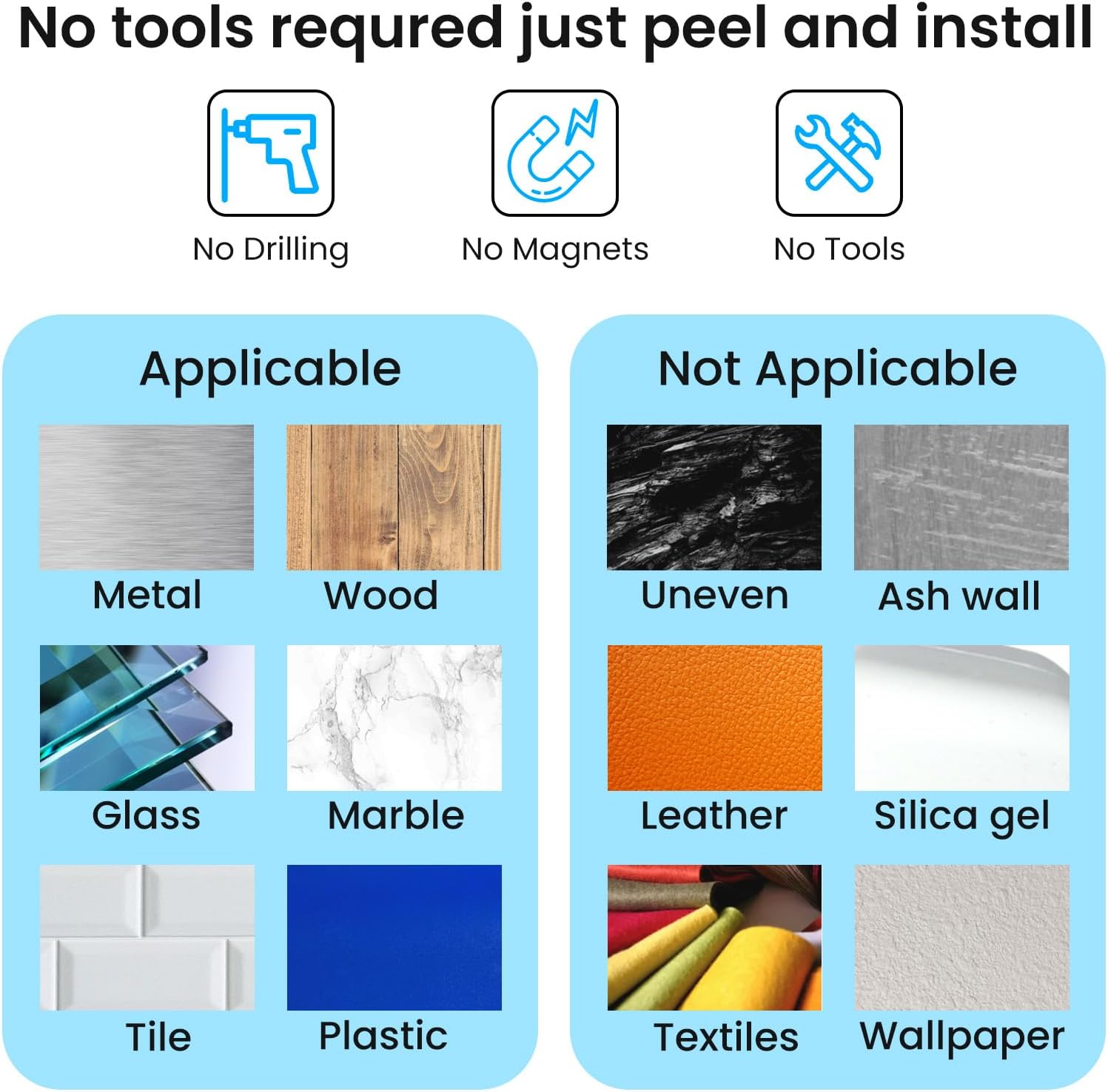 - Suitable for many kinds of surfaces: whether Vinyl, glass, wall, ceramic, wood, metal, plastic, they can stay firmly on the surface.