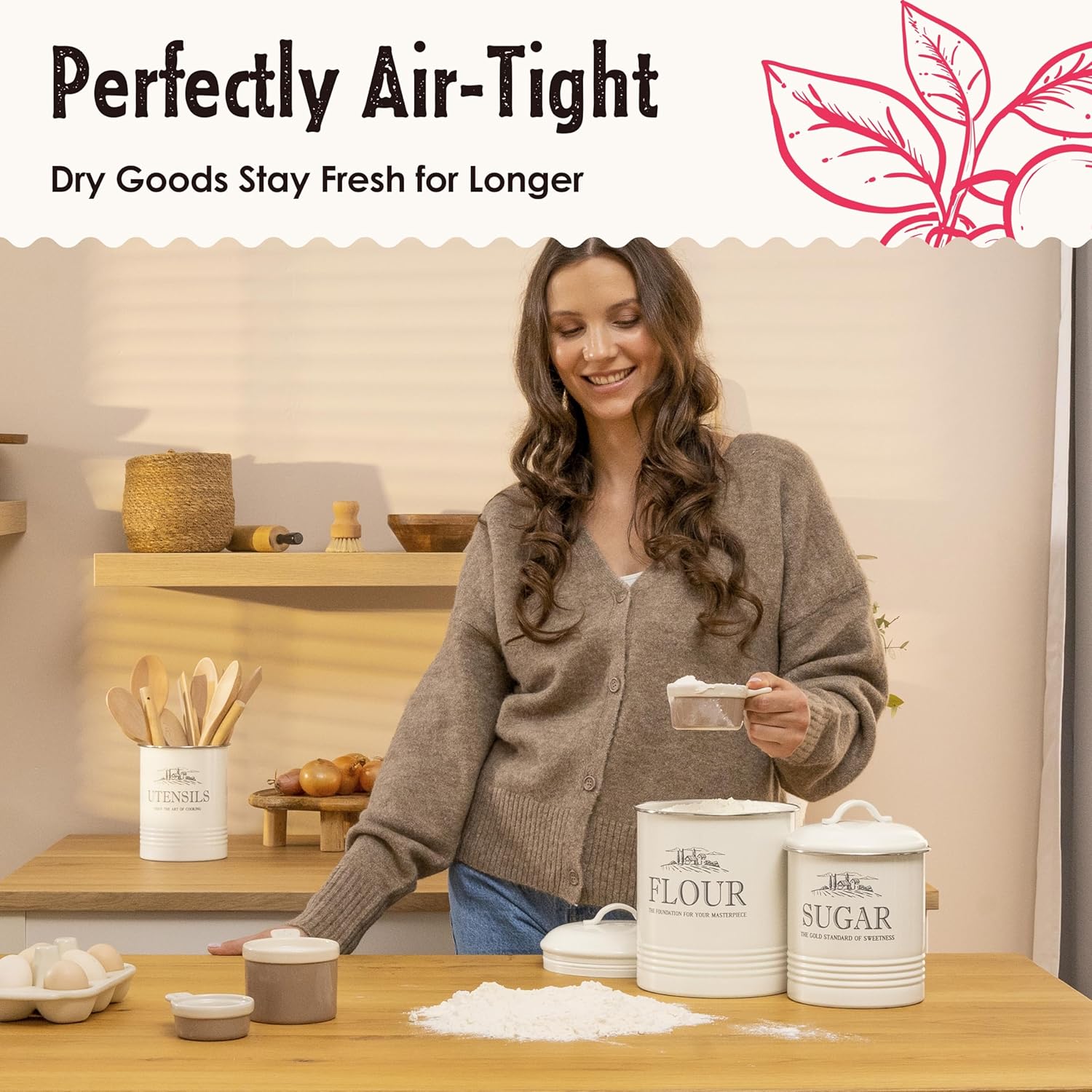 Canisters for Kitchen Counter, Set of 3 - Airtight Sugar and Flour Containers & Kitchen Utensil Holder, Rustic Farmhouse Canister Set for Kitchen Countertop