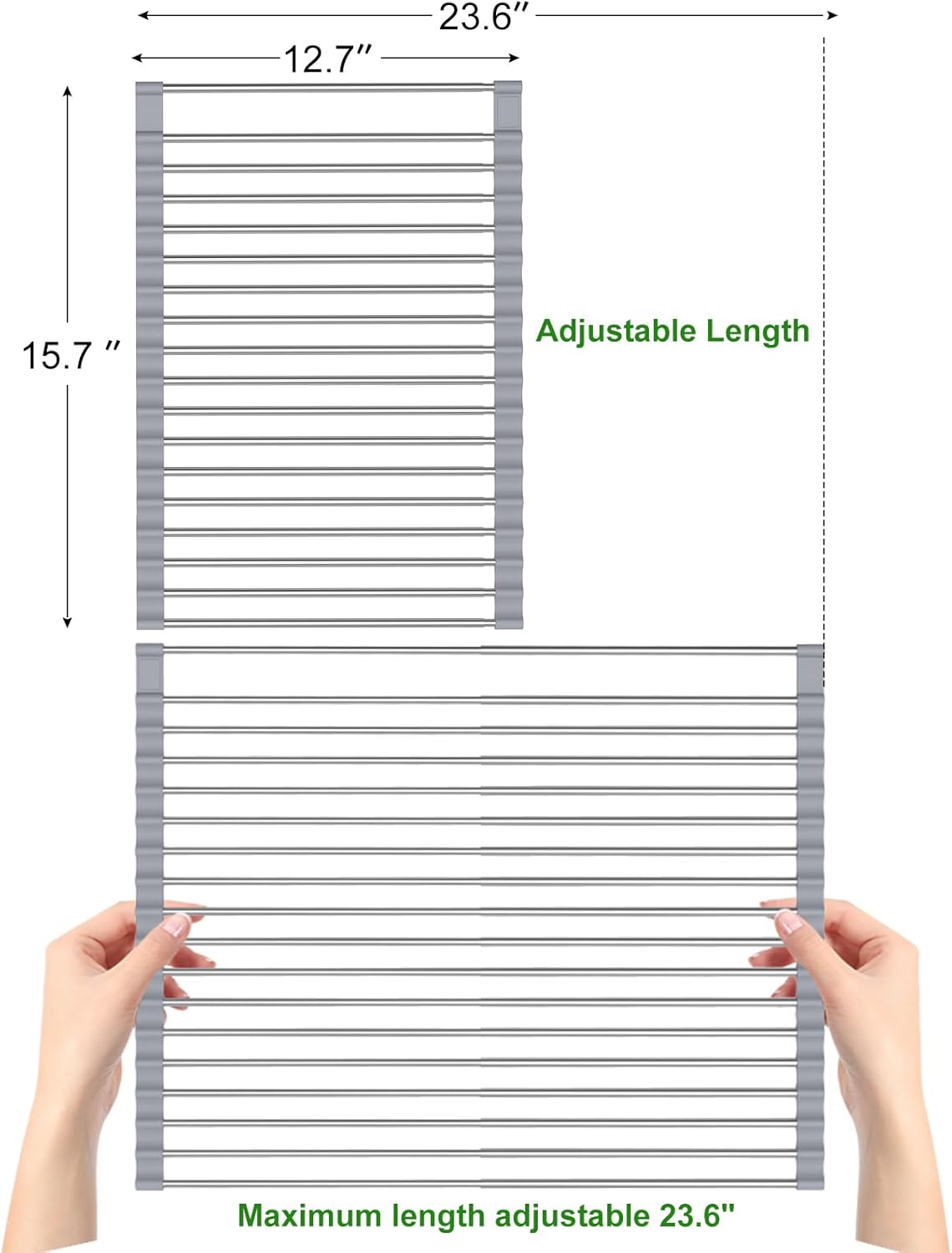 - Expandable Dish Drying Rack: This sink drying rack can be adjusted in size as desired,with adjustable lengths from 12.7" to 23.6" (Width: 15.7”), fitting most sink up to 22", over sink dish drying rack easily meet the drying needs of different tableware