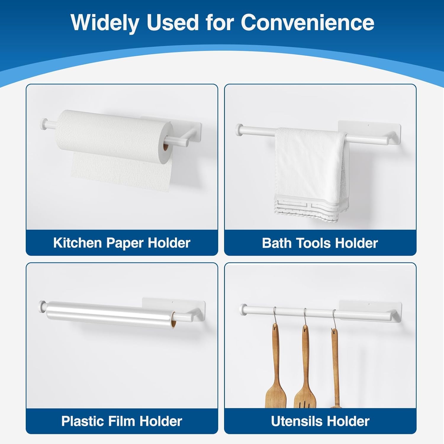Paper Towel Holder - Self-Adhesive or Drilling, White, Wall Mounted, SUS304 Stainless Steel Kitchen Roll Dispenser Under Cabinet
