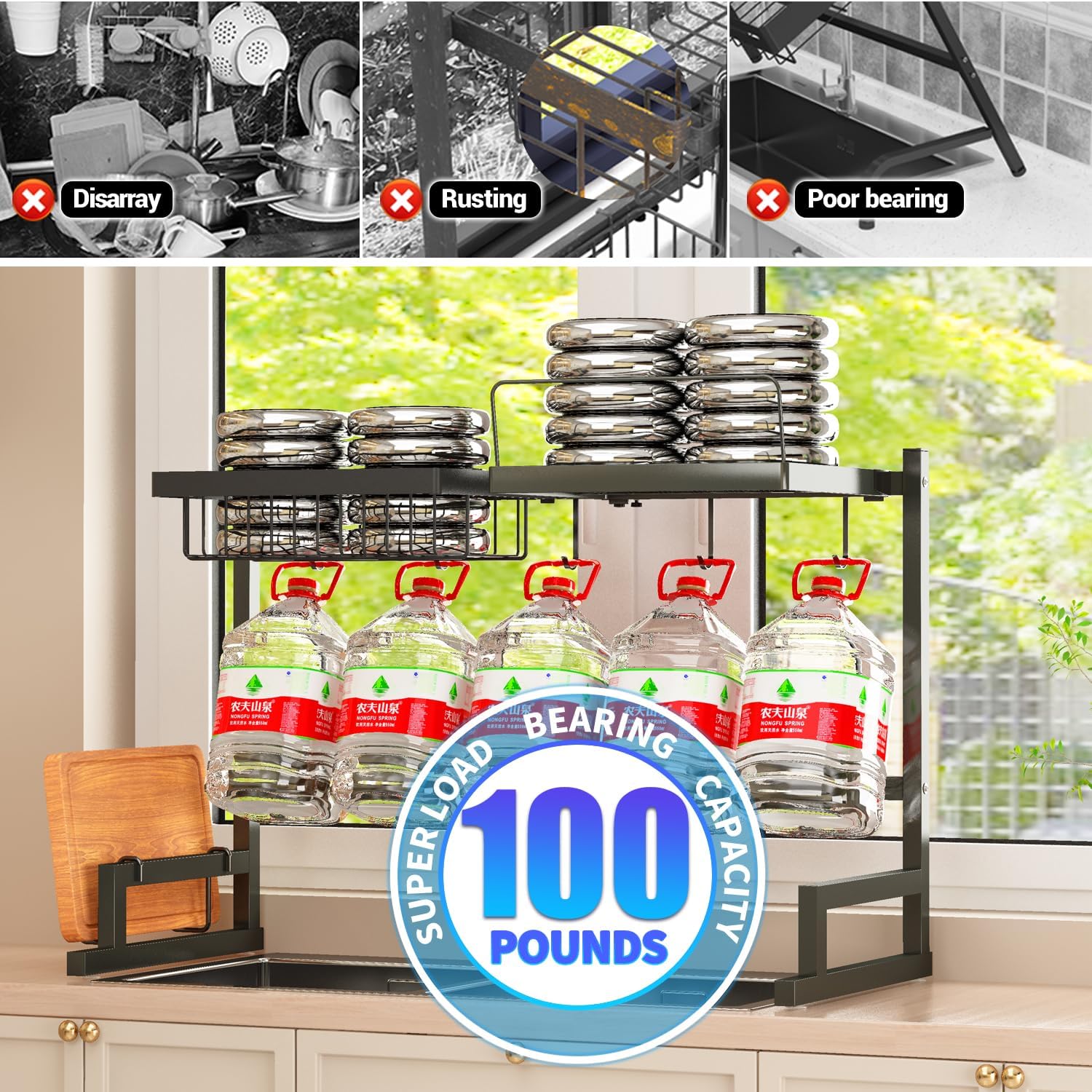 - 【2024 3-Tier Huge and Massive Version】2024 Upgraded 3-Tier Version with strengthened stainless steel and adjustable length and height to fit most kitchen sink. Please note this is a Huge and Massive over sink dish rack with a loading capacity up to 144lb that you can put on all your kitchen stuff.