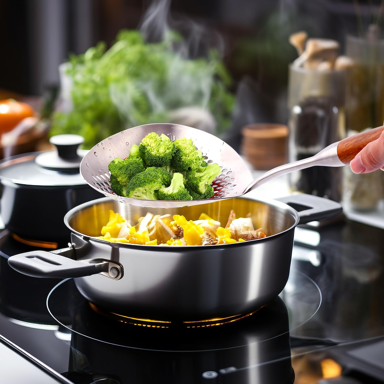 - PERFECT FOR DEEP FRYING: Our skimmer spoon is a great helper in the kitchen when you need a fryer scoop for frying crisps, fried chicken, scooping up pasta, broccoli, wontons, or eggs. The strainer with a handle features an 8.7-inch wooden handle, allowing you to step away from the hot oil without risking burns