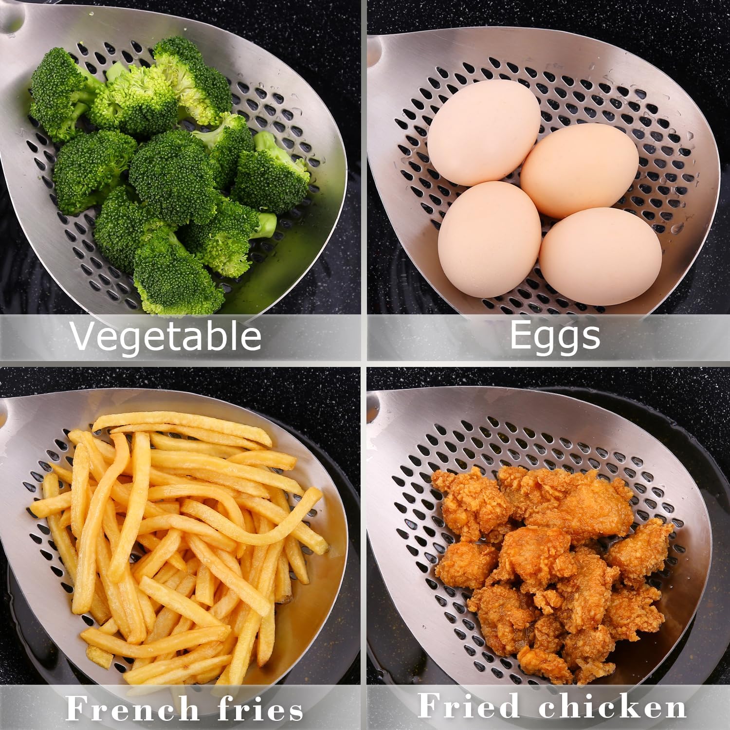 - STAINLESS STEEL Frying Spoon Strainer: Lyveit fryer scoop is made of 18/8 stainless steel, which is food-safe, rustproof, heat resistant, and won't melt like plastic in hot oil