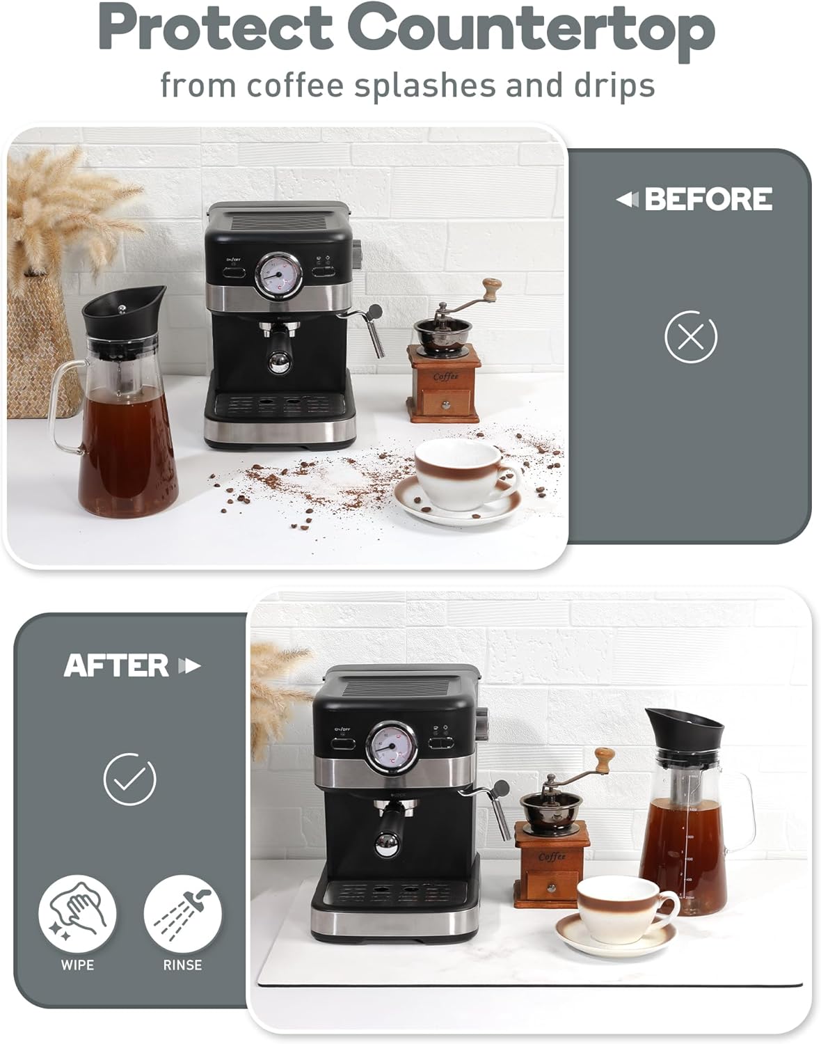 - Easy To Clean - Featuring a PU leathaire surface, this coffee mat is both stain-resistant and easy to maintain. You can simlpy wipe up the spills and grounds, or give it a quick rinse, and the mat will look as good as new. It provides excellent protection for your countertop against splashes and drips, effectively keeping it free from coffee stains.