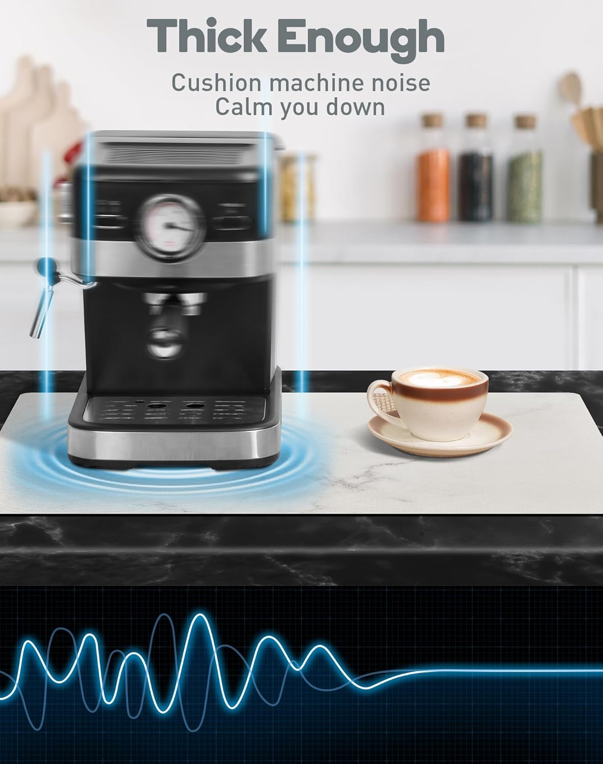 - Noise-dampening & Heat-resistant - Our coffee bar mat is 1/6" thick, which can effectively cushion coffee machine noise and reduce clinking sounds as cups touch the tabletop, ensuring you a tranquil and pleasant coffee experience. Additionally, it provides ample protection for your countertop, effectively shielding it from the heat of boiling water.