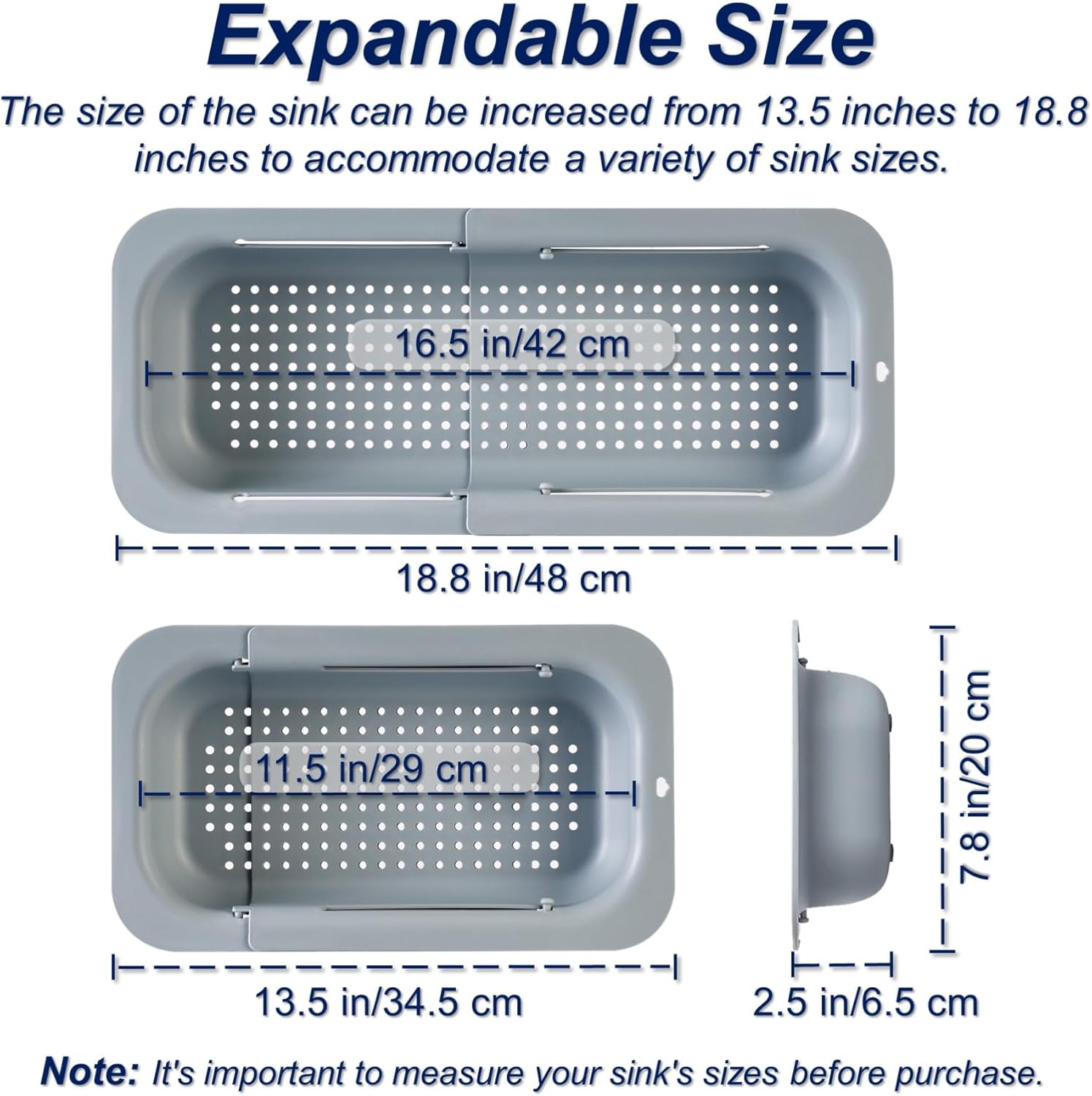 - [Large Capacity and Space Saving] The container can hold and release up to 5 quarts of food, including pasta, potatoes, broccoli, green beans, tomatoes, and other vegetables. The sink colander strainer basket has the capability to be conveniently increased in size from 13.5 inches (approximately 34.5cm) to 18.8 inches (approximately 48 cm) in order to accommodate various sink sizes. This adaptable structure is specifically designed to be easily placed without occupying excessive space.