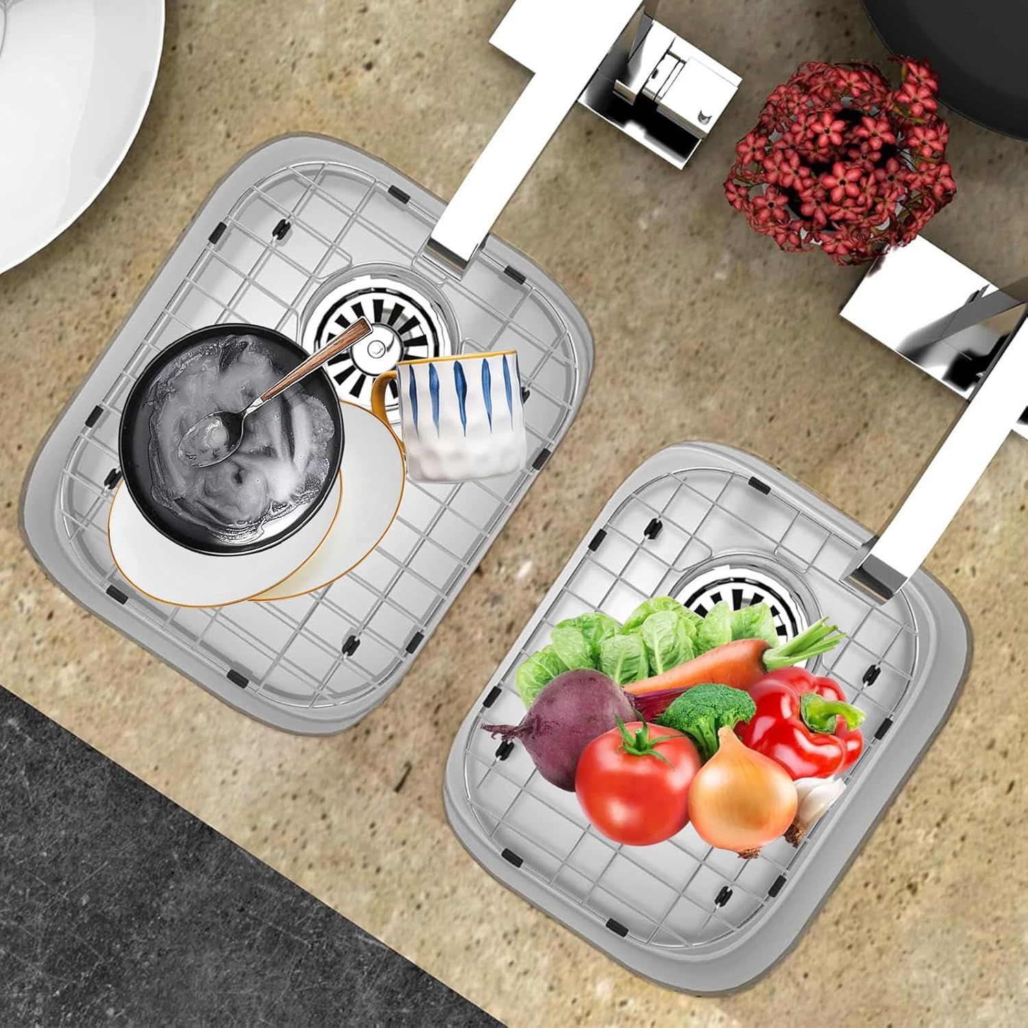 - Protective Sink Grid for Kitchen Sink - Sink grid is the simplest way to protect your sink surface from scratches and damage by pots, pans, cutlery and dishes. The protective rubber feet and bumpers ensure the grids leave no marks.