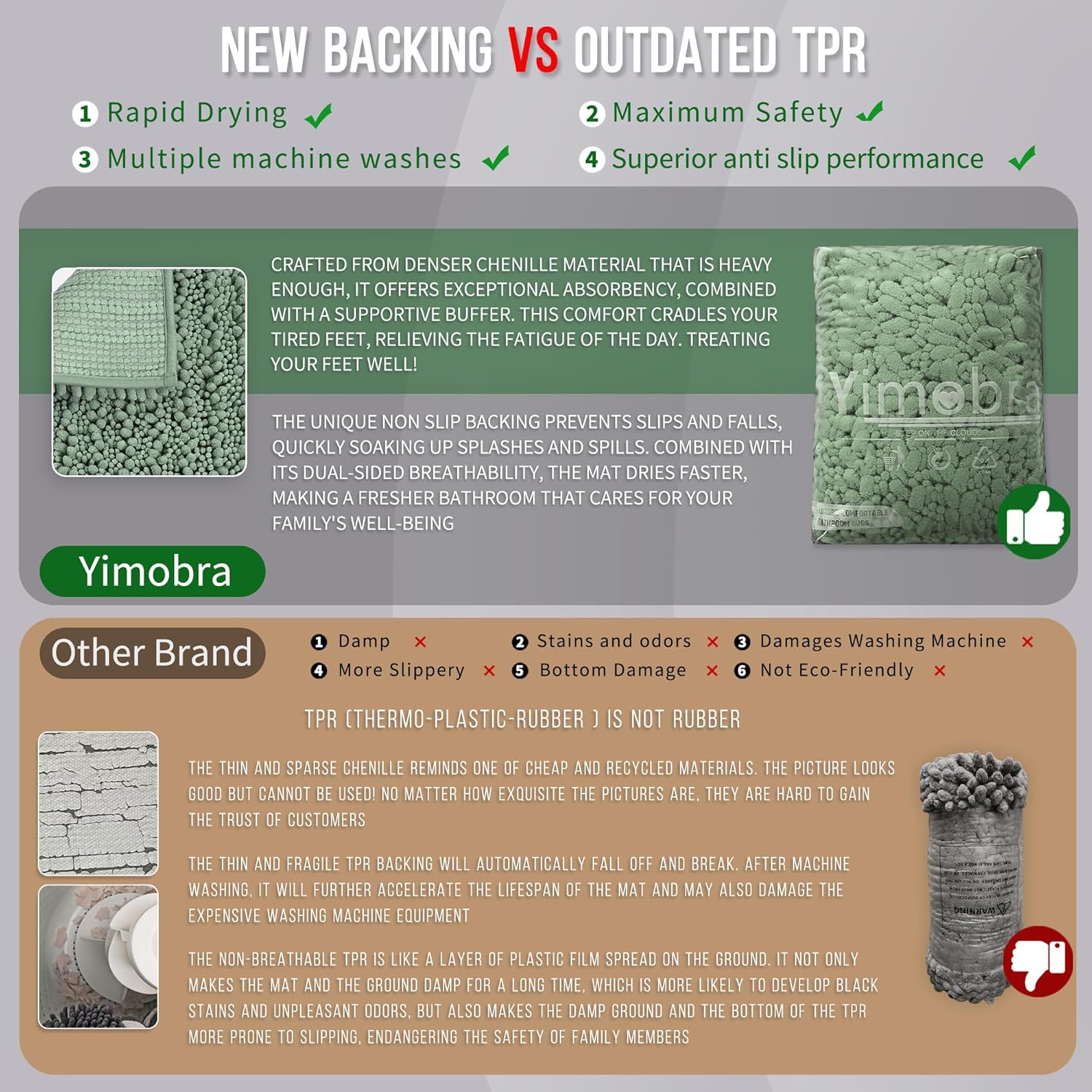- Total Grip Safety & Quick Dry: Yimobra bath rug features a feather-light yet ultra-grippy hot-melt backing that stays firmly in place on wet surfaces. Its vertical air-channel chenille fibers ensure rapid and complete dryness, providing instant dry safety the moment you step out of the shower. The product is tested for harmful substances, performance, longevity, and emissions in accordance with the OEKO-TEX Standard 100