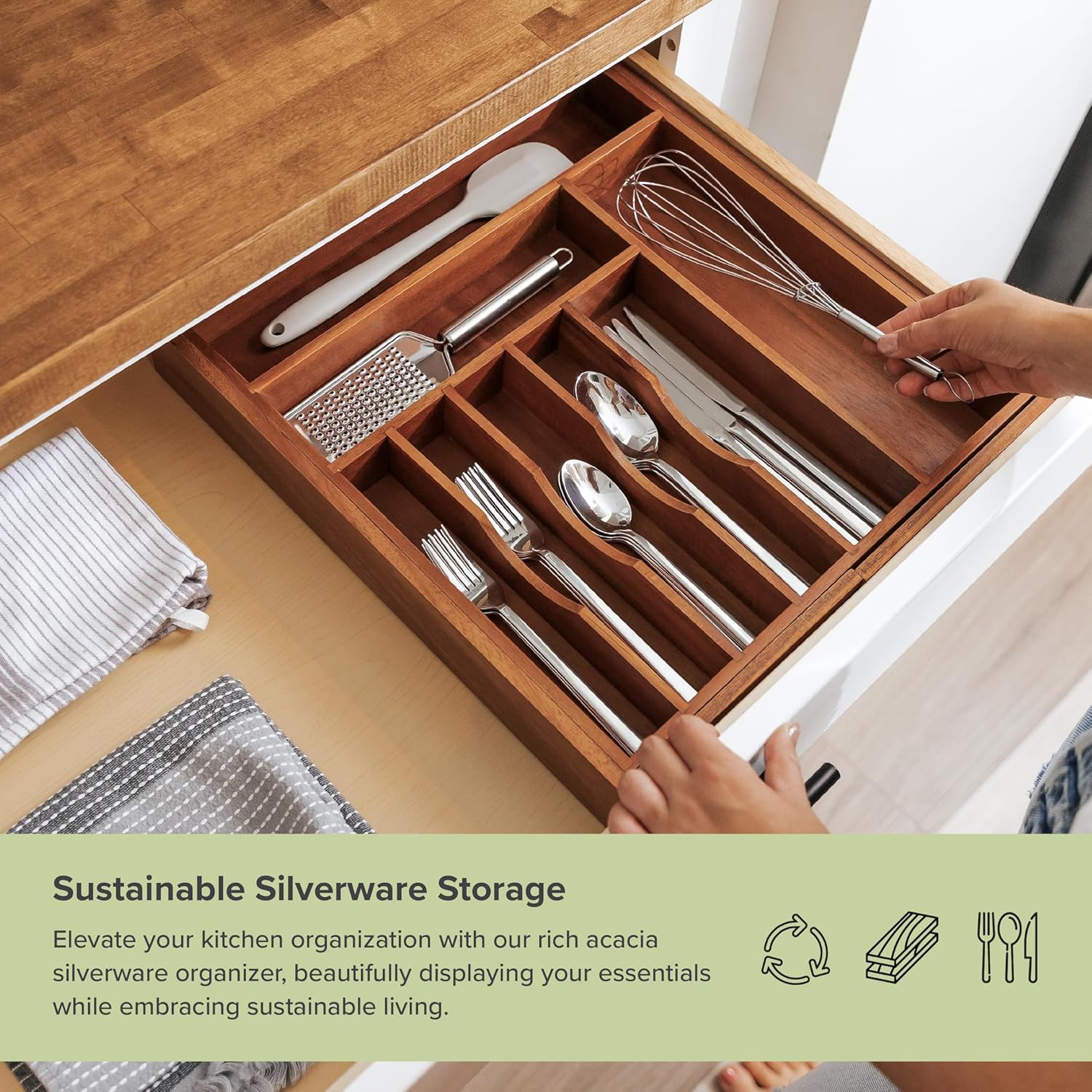- PREMIUM FLATWARE ORGANIZATION - Efficiently sort and store your flatware with our spacious acacia organizer. Featuring 6 unique compartments, it neatly arranges big forks, small forks, big spoons, small spoons, knives, and serving spoons. Our thoughtfully designed dividers ensure easy access to each piece. Notably, this organizer can accommodate up to 12 complete flatware sets (depending on design).