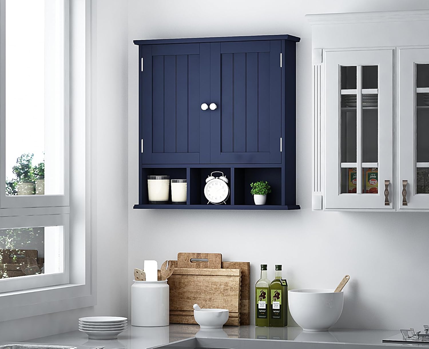 ChooChoo Bathroom Cabinet Wall Mounted 2-Door with 3 Open Shelves, Wooden Medicine Cabinets with Adjustable Shelf,Space Saver Storage Cabinets Over The Toilet for Bathroom&Living Room,Blue