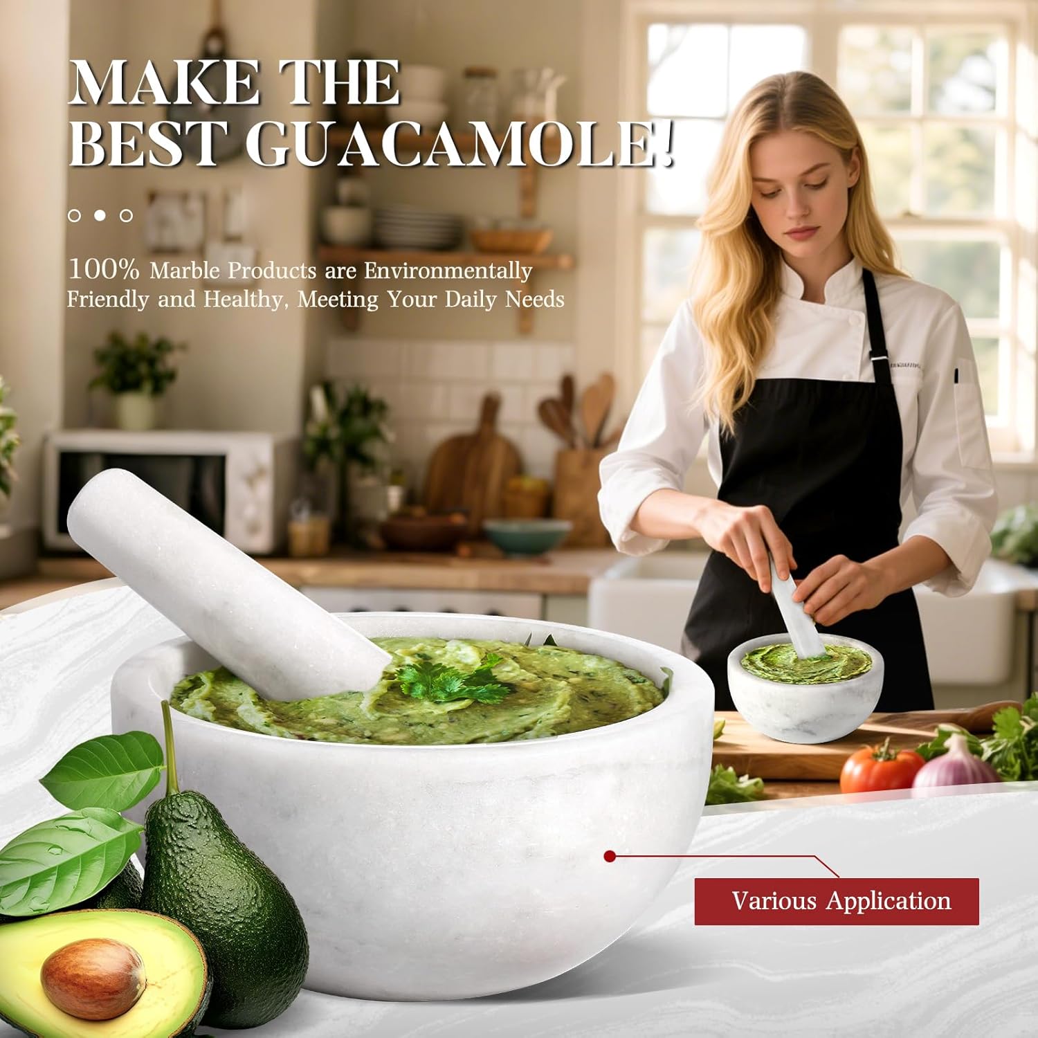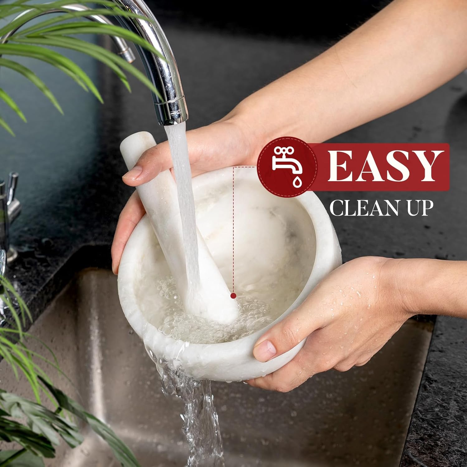 - Healthy and Safety: The marble mortar and pestle set is super safe in contact with food. Natural stone has superior safety properties that will not spoil the flavor of food or leave food residue, The external is well-polished, super easy to clean