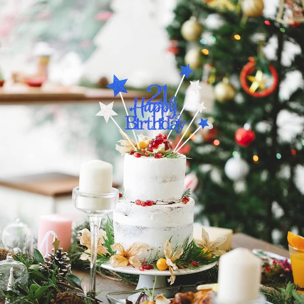 Glittery 21st Happy Birthday Cake Topper with Star,Personalised 21 Birthday Cake Toppers Party Decorations Party Supplies for Boys Girls Blue