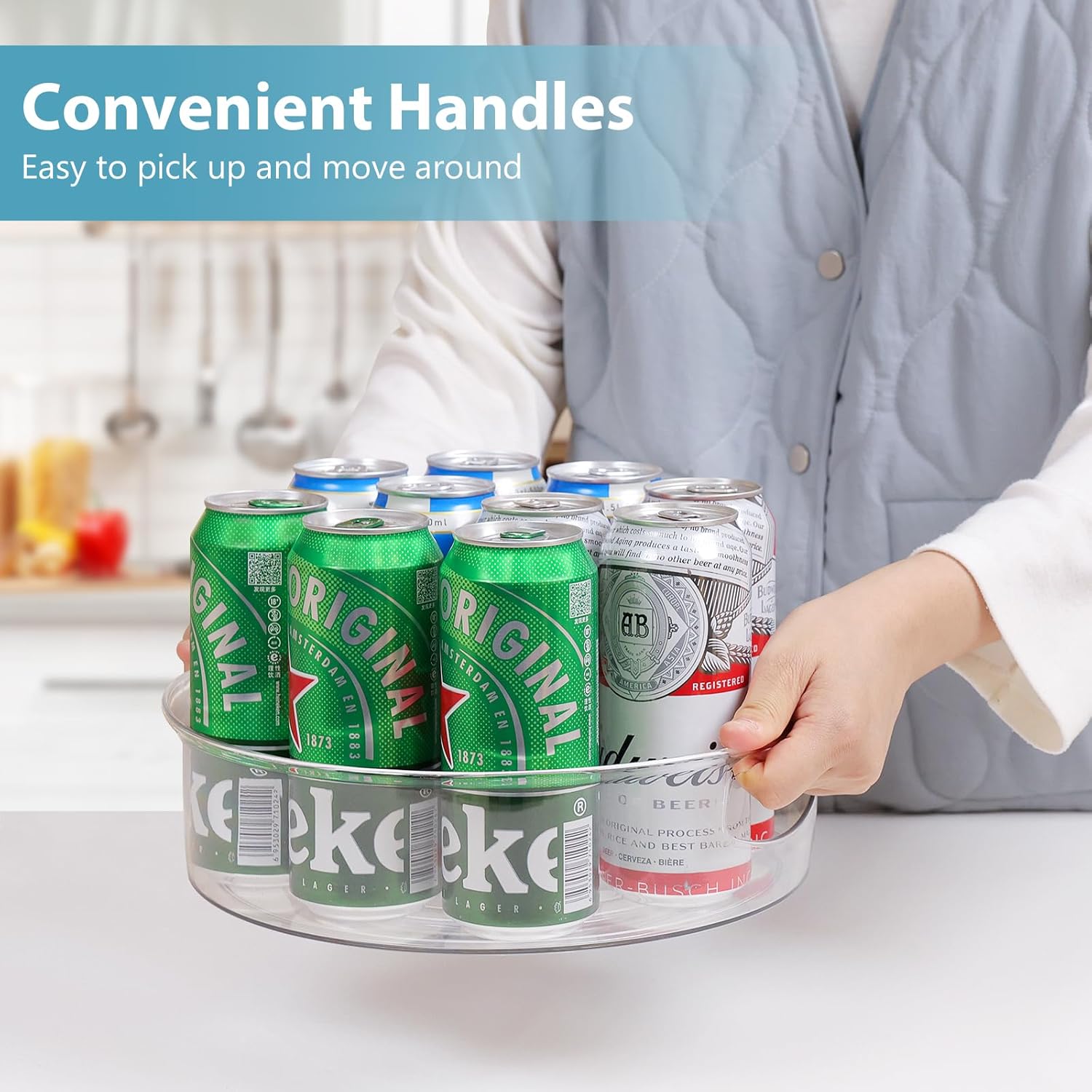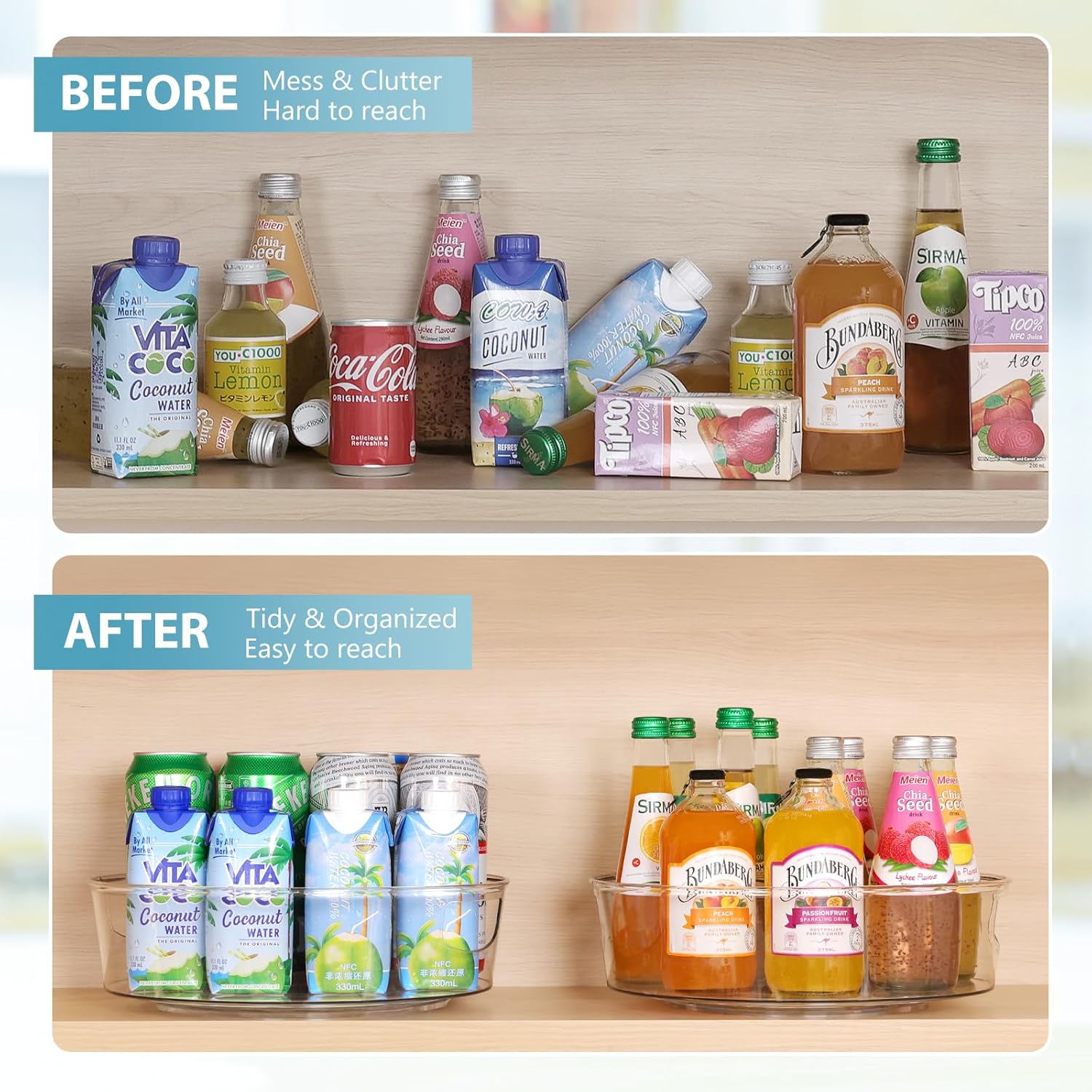 - High Sides & Handle Design- Our pantry lazy susan comes with raised edge, providing excellent support and preventing items from falling off even when the lazy susan is rotating quickly. And the built-in handles make it easy to carry and move to anywhere you want