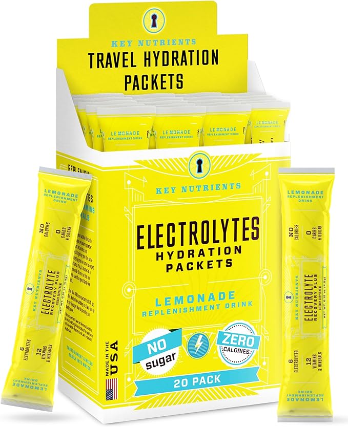 KEY NUTRIENTS Electrolytes Powder Packets - Refreshing Lemonade 20 Pack Hydration Packets - Travel Hydration Powder - Made in USA - No Sugar, No Calories, Gluten Free