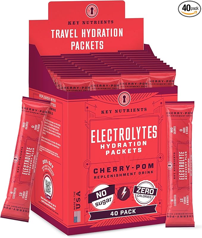 KEY NUTRIENTS Multivitamin Electrolytes Powder Packets - Sweet Cherry-Pom 40 Pack Hydration Packets - Travel Hydration Powder - No Sugar, No Calories, Gluten Free - Made in USA