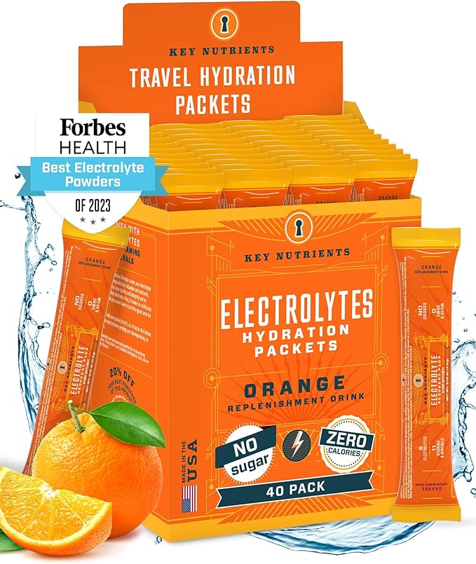 KEY NUTRIENTS Electrolytes Powder Packets - Tangy Orange 40 Pack Hydration Packets - Travel Hydration Powder - Made in USA - No Sugar, No Calories, Gluten Free