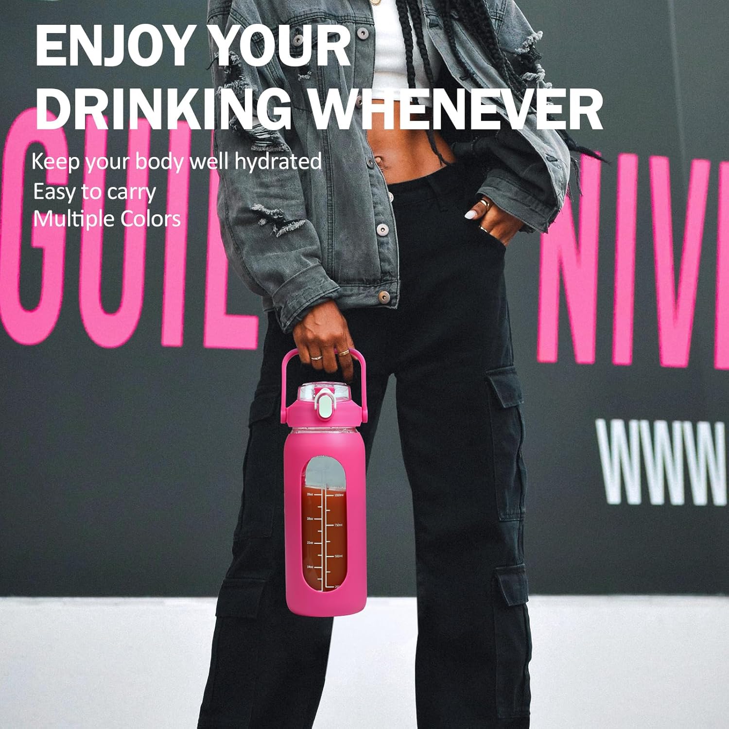 - ❤More Function- Our glass water bottle with stylish silicone sleeve which provides more grip and prevents the water bottle from slipping out. -This large motivational water bottle has a wide mouth, not only easy to hold ice cubes and fruit but also very easy to clean, you can use our complimentary cup brush to clean your water glass. -Handle on the lid for easy portability.