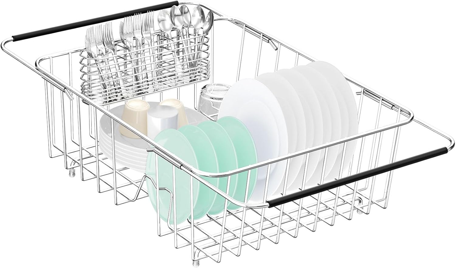 Large Dish Drainer Rack in Sink Adjustable, Expandable 304 Stainless Steel Metal Dish Drying Rack Organizer with Stainless Steel Utensil Holder Over Inside Sink Counter, Rustproof