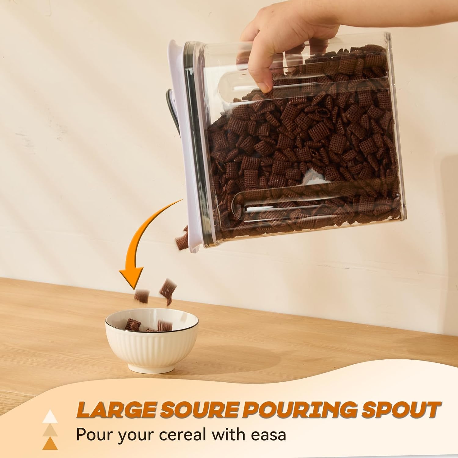 - LARGE SQUARE POURING SPOUT - No more waggling your cereal out of the box each morning! Our sleek designed storage container with grips and upgraded large square pouring spout will reduce spillage and allow you to pour precisely the amount wanted with a smooth flow! Pour your cereal with ease!