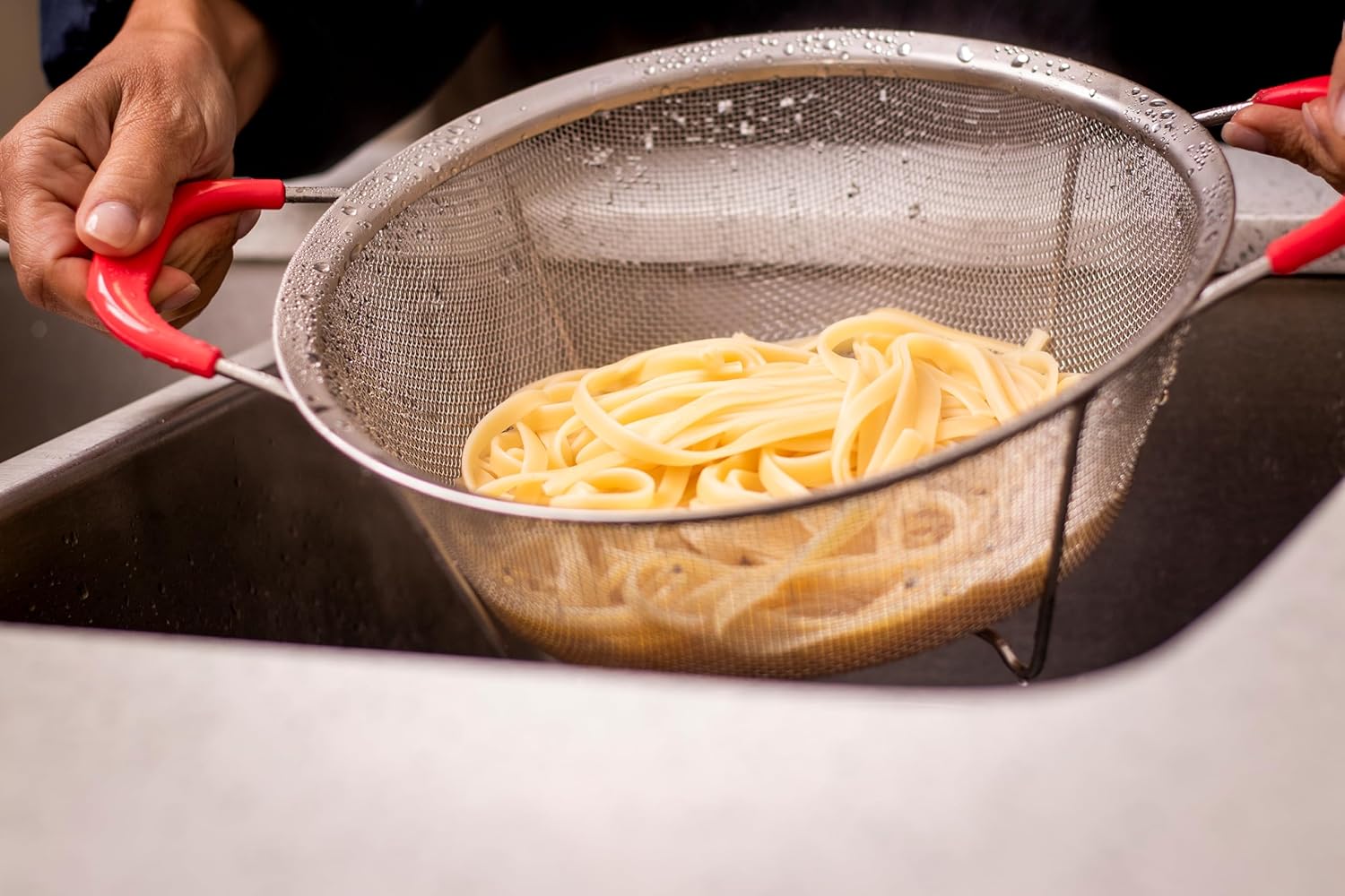 - Hercules Chef by Mundial 9.8-inch (25 cm) Stainless Steel Basket Colander Strainer with Silicone Red Handles.