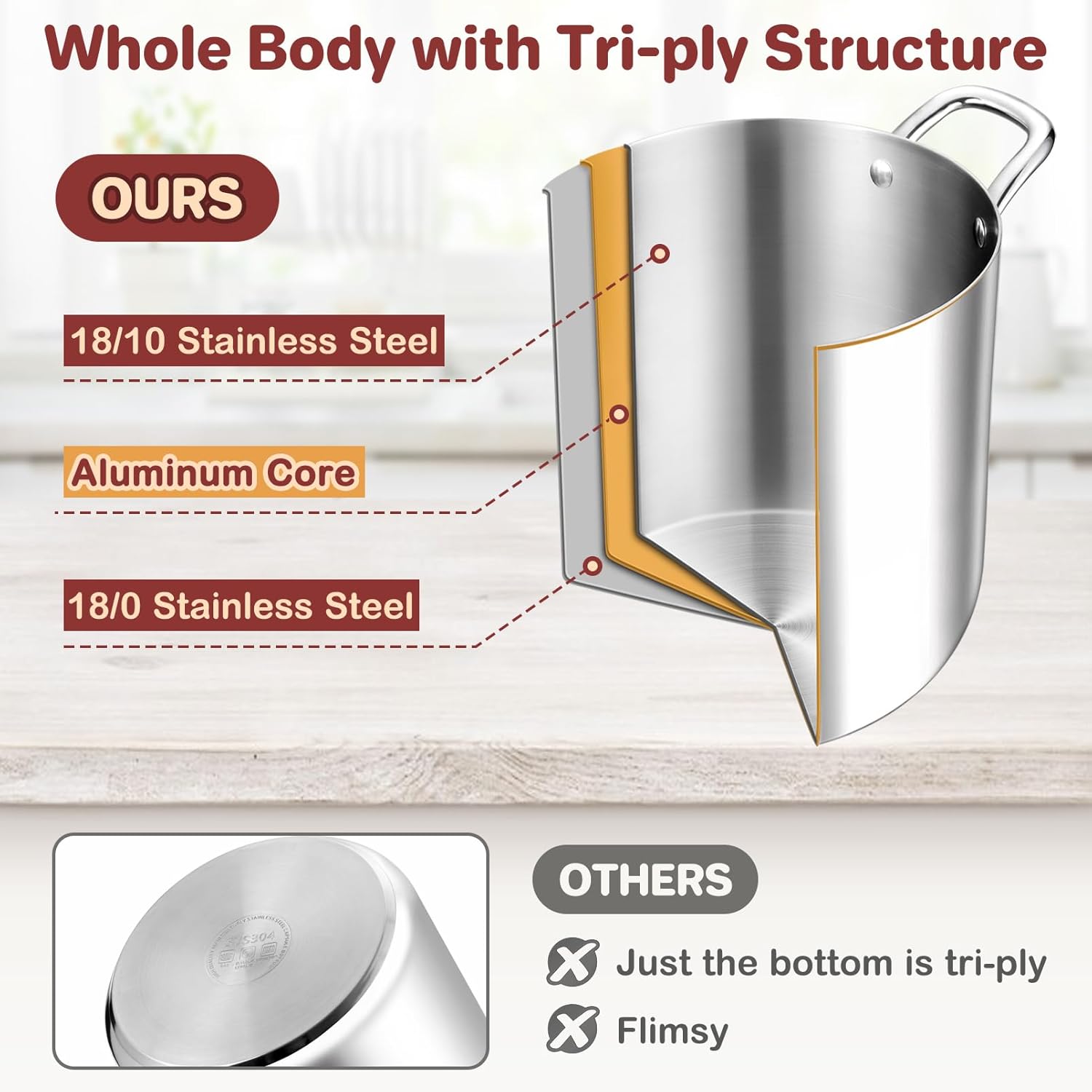 - HEALTHY & TRI-PLY CONSTRUCTION – The whole body of 12QT stock pot is made of 2 layers of stainless steel (18/10 stainless steel inner, 18/0 stainless steel outer) and 1 layer aluminum core, The lid is made of food grade tempered glass, No coating or toxic substance leaching into your food, Healthy and safe for daily cooking