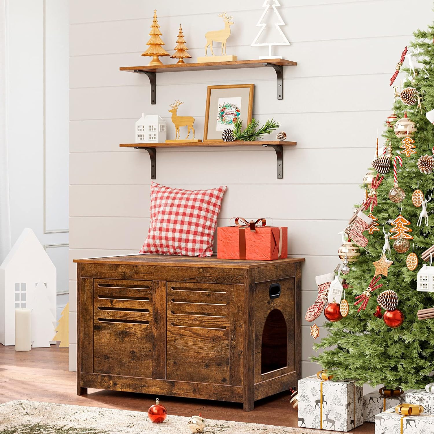 DINZI LVJ Long Wall Shelves, 31.5Inch Wall Mounted Shelves Set of 4, Extra Large Floating Storage Ledges with Sturdy Metal Brackets for Living Room, Bathroom, Bedroom, Kitchen, Rustic Brown