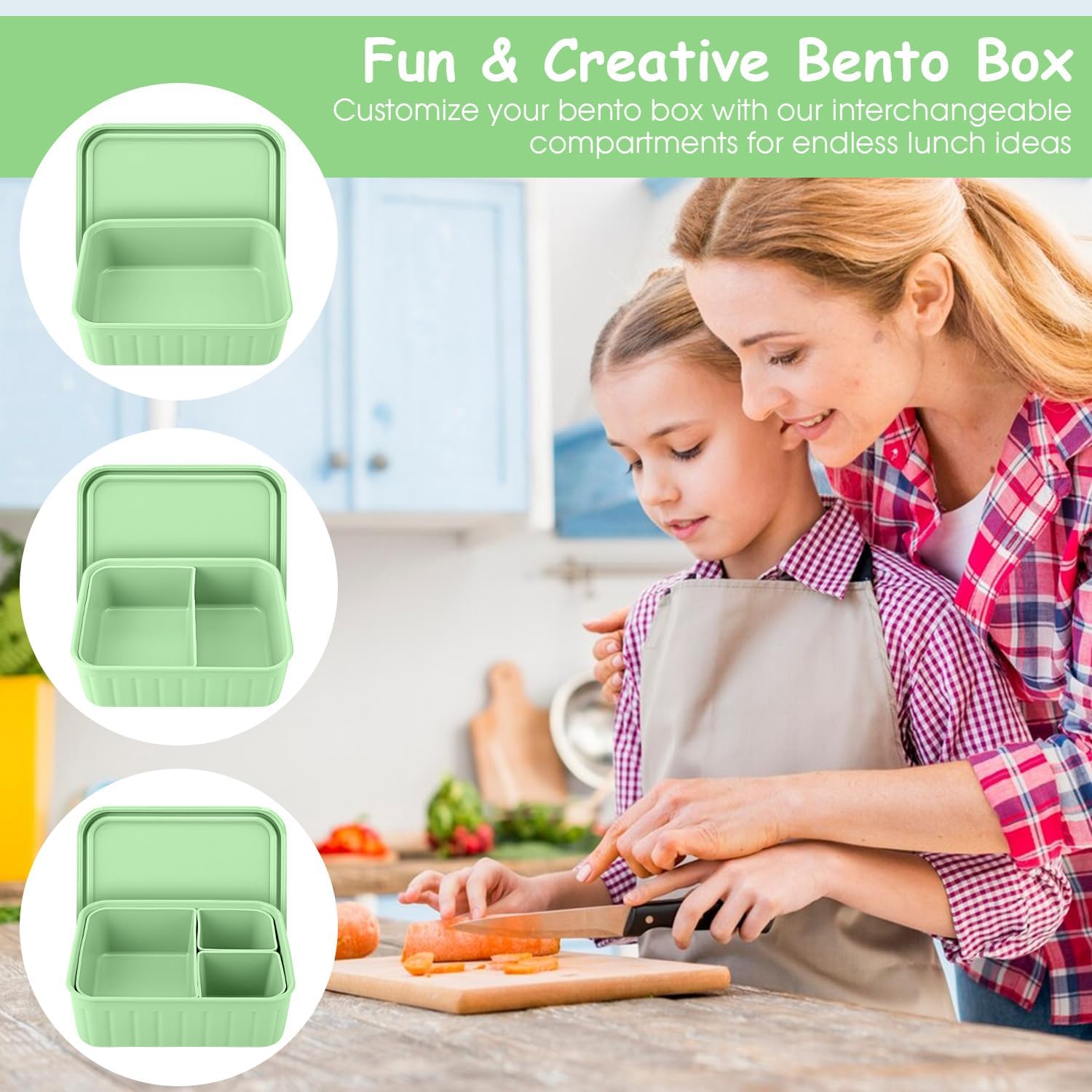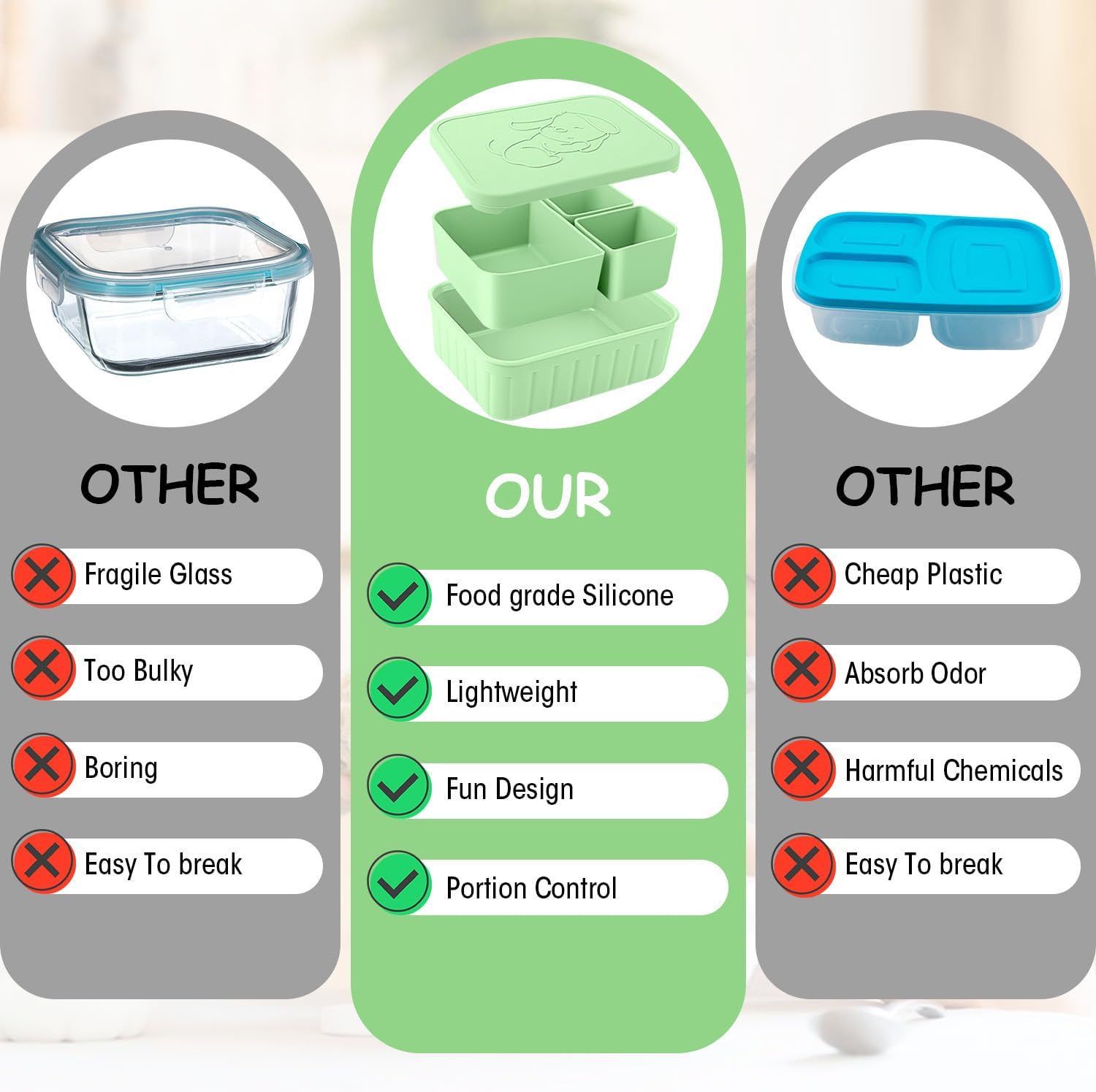- 【Say Goodbye to Mess】The silicone bento box lunchbox for Kids has individual compartment to keep food neat and separate. The leak proof silicone lids seal tightly around the lip of the container and ensure that the box remains tightly sealed during transport, preventing any spills or accidents. Easy to open and close for little fingers. Meanwhile,anti-slip design make the silicone bento box more safe