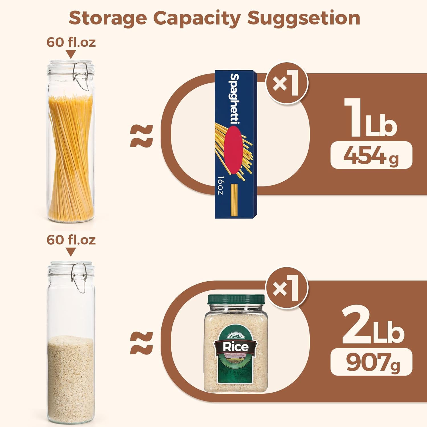 - Airtight Spaghetti Container: The Spaghetti jar is made of food-graded glass; Each kitchen canisters for countertop is well sealed, equipped with a silicone gasket and a stainless iron locking clamp to make sure your food stay clean and fresh in storage