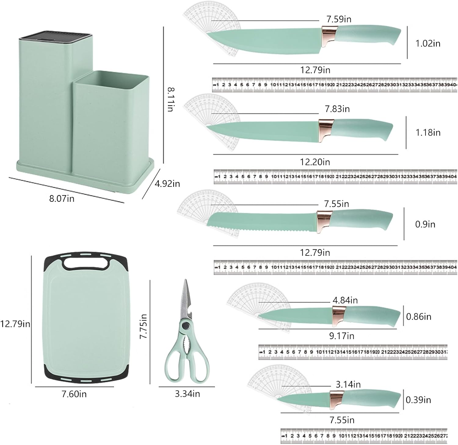 - 6-IN-1 KNIVES SET: the set includes a 12.8-inch serrated bread knife, 11.8-inch chef's knife, 11.8-inch slicing knife, 9.25-inch utility knife, 7.6-inch fruit knife, kitchen shears, and a knife holder for storing kitchen utensils Block.