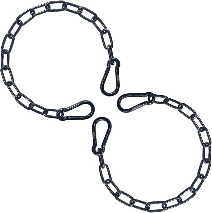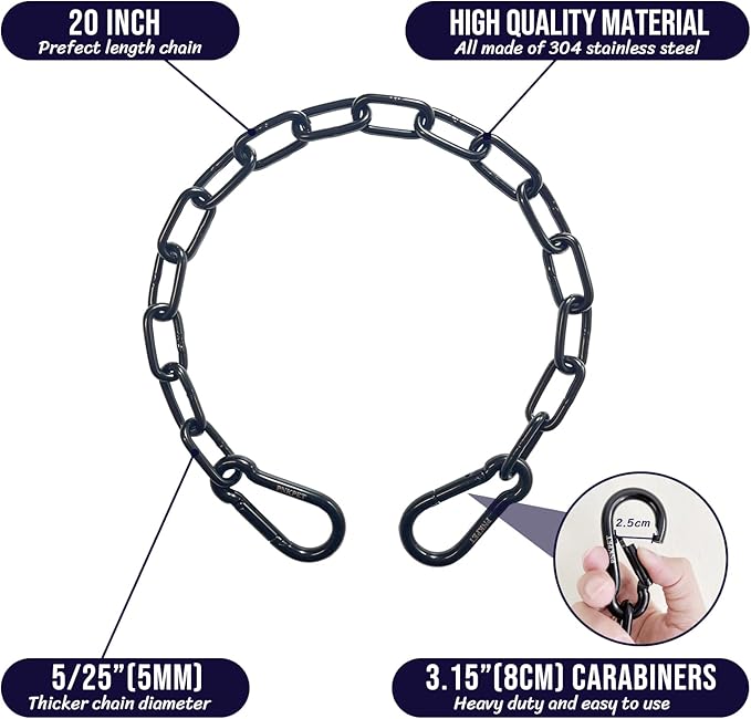 - Shopping Guide - The product includes one large 20-inch long stainless steel chain and two large carabiners. The color is black, and the weight of each individual product is 12.2 ounces Please feel free to contact us if there is any missing product accessories or any problems in use.