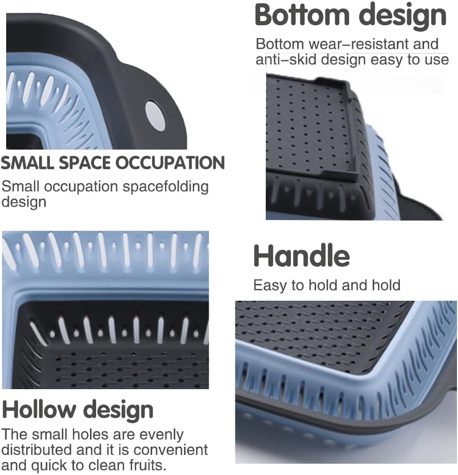 Collapsible Colander Set, Square Round Triangles Silicone Kitchen Strainer Perfect for Draining Pasta Vegetable fruit 2 PCS (10.8"L x 8.6"W x 2"H, Blue & Gray)
