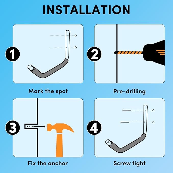 - 【Easy To Install】Kayak storage hook easily mounts to a variety of surfaces including plaster, wood, brick and concrete walls. Only 4 steps to complete the installation: 1) Choose and mark the postion for installation. 2) Use the driller to drill hole on the wall according to the size of the expansion anchors. 3) Insert the drywall anchors into the hole and put the kayak hanger on the wall. 4) Use the screw driver to tighten the screws on the kayak hooks(Included screws and plastic anchors )