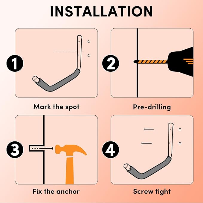 - 【Easy To Install】Kayak storage hook easily mounts to a variety of surfaces including plaster, wood, brick and concrete walls. Only 4 steps to complete the installation: 1) Choose and mark the postion for installation. 2) Use the driller to drill hole on the wall according to the size of the expansion anchors. 3) Insert the drywall anchors into the hole and put the kayak hanger on the wall. 4) Use the screw driver to tighten the screws on the kayak hooks(Included screws and plastic anchors )
