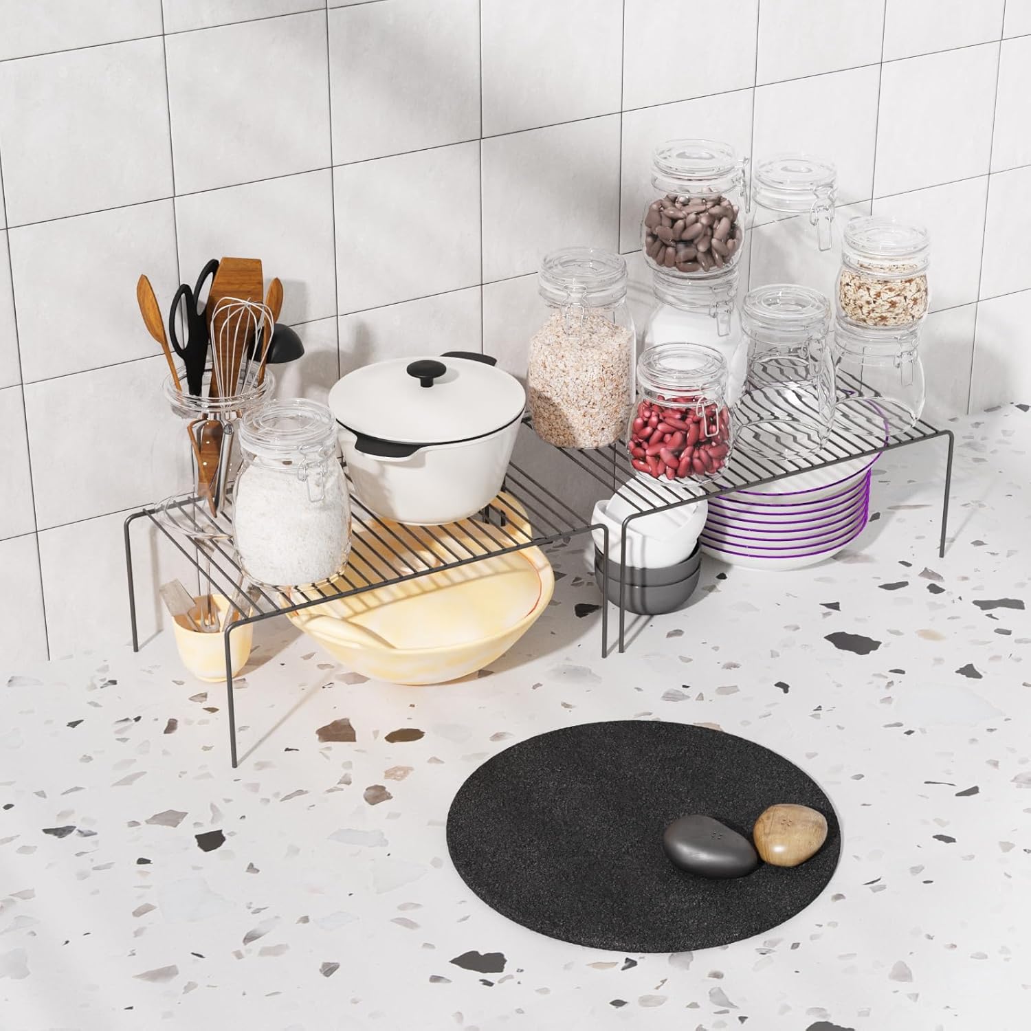 - Perfect Size: Each wire shelf measures 13''L x 9.4''W x 5.5''H. Perfect size makes this cabinet shelf rack perfect for you to organize your kitchen supplies, you can easily organize your jars, pots, pans and spices etc