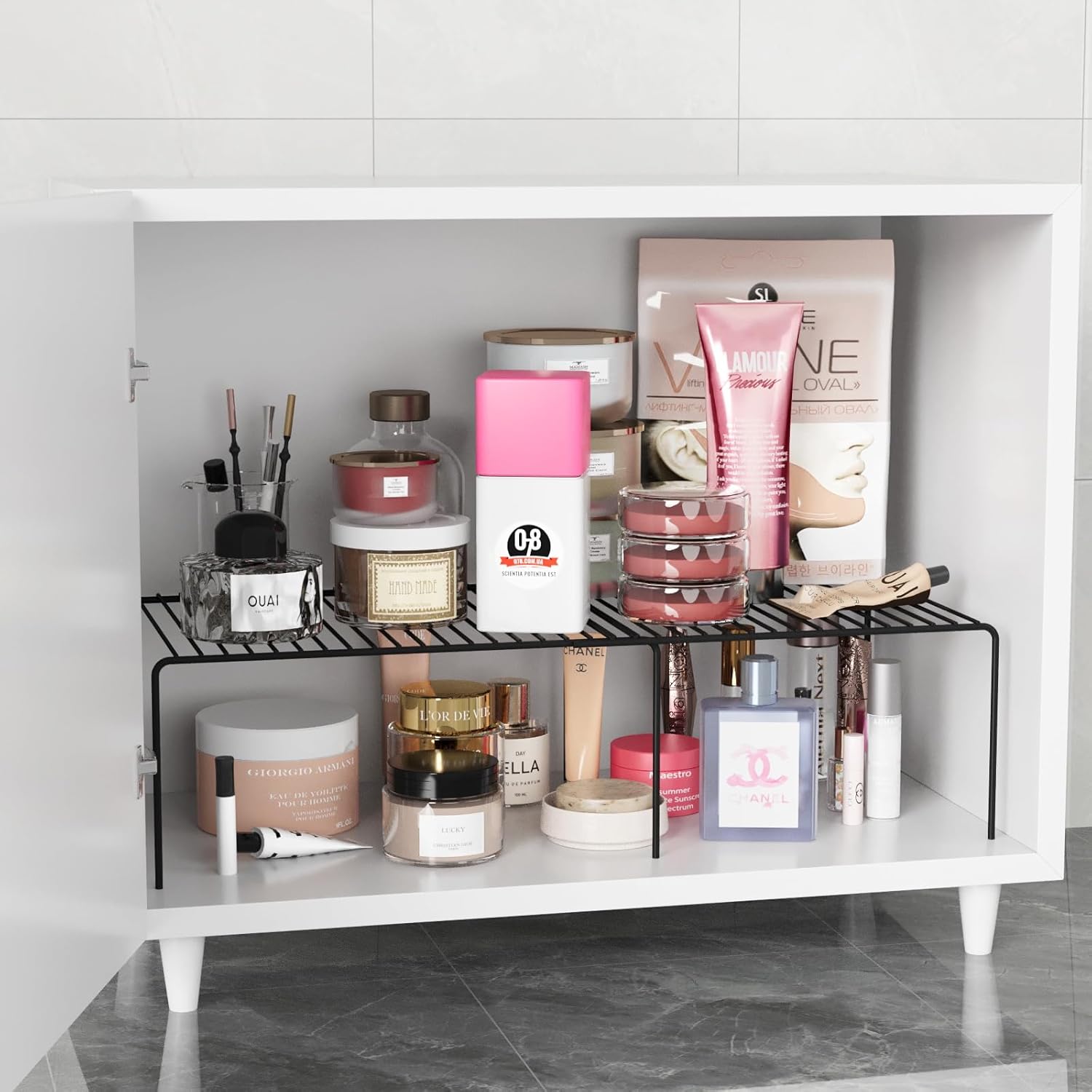 - Multifunctional Shelf Rack: Our cabinet organiser is ideal for storing your plates, pans, mugs, bowls, Bottles, cans, seasonings, etc. Perfect shelf to keep everything organized in the cabinet, pantry, cupboard, closet, drawer, or countertop in the kitchen, bathroom, bedroom, and under the sink