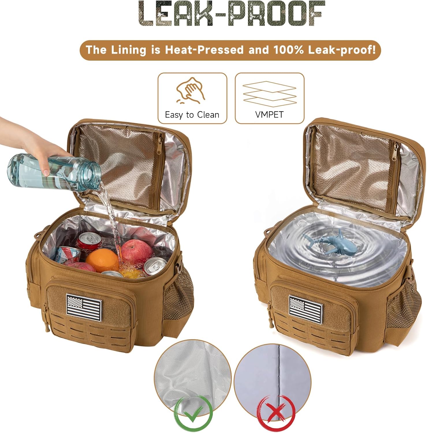 - 【Excellent Design】We've created an insulated lunch box with a blend of outdoor inspiration, giving it a fresh take on a classic military design. The Laser Cut Molle Webbing Design adds a special stylistic touch that sets it apart. The front pocket has a velcro patch area to personalize with different patches. This lunch box meets the needs of outdoor enthusiasts and military fans. It also makes a perfect gift for men, dads, husbands, boyfriends, and sons.