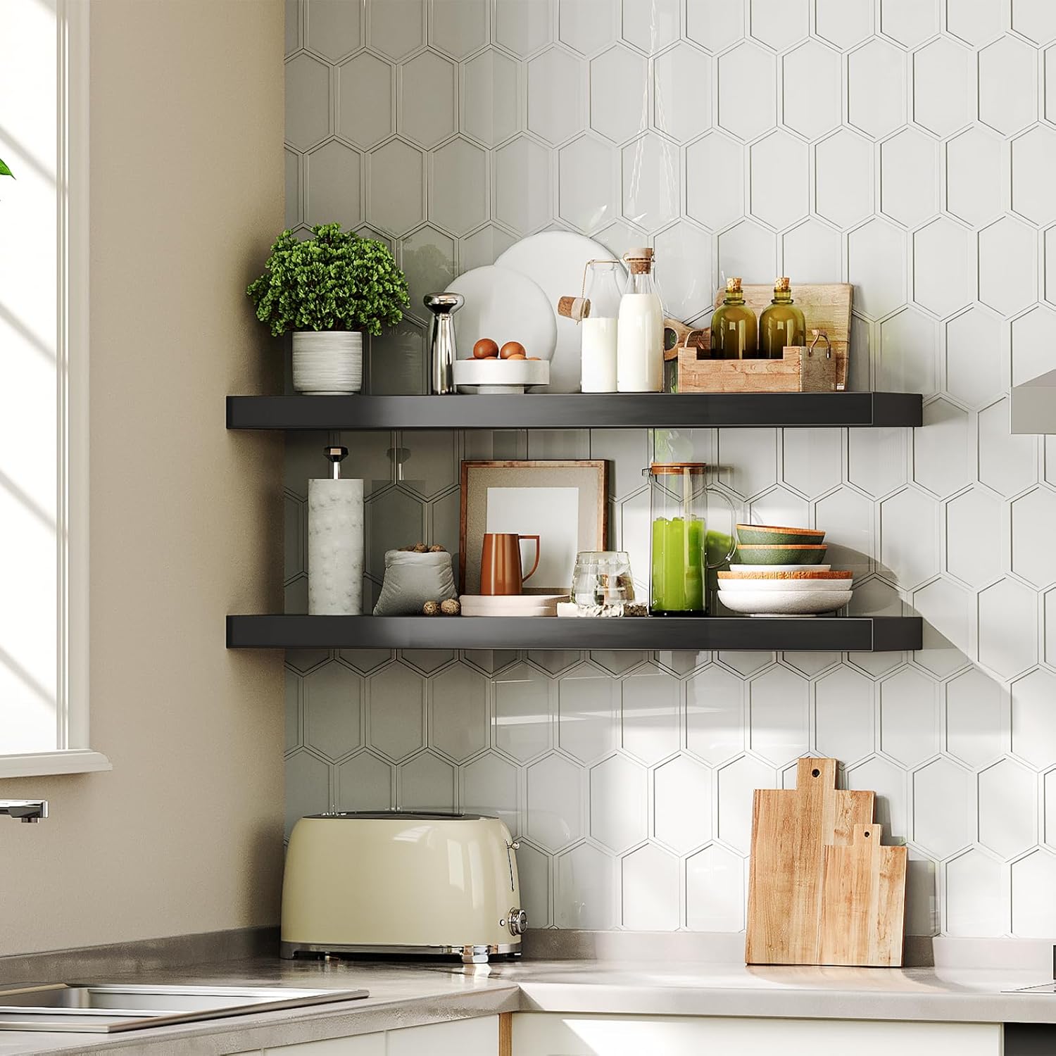 - High Quality: Sized in 31.5"L x 7.9"W x 1.5"H. The 1.5" thick floating shelves for wall are fixed with Invisible and enhanced dual-pipe iron Brackets, stable with great load up to 22 lb per wall mounted shelf