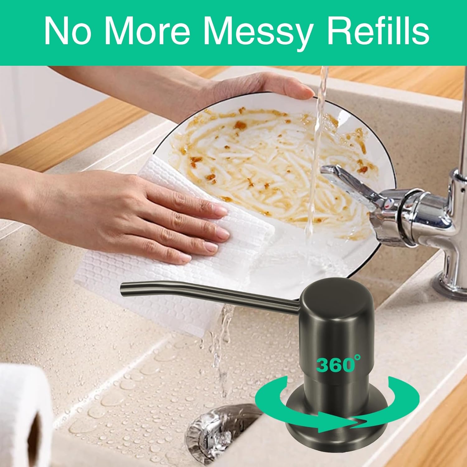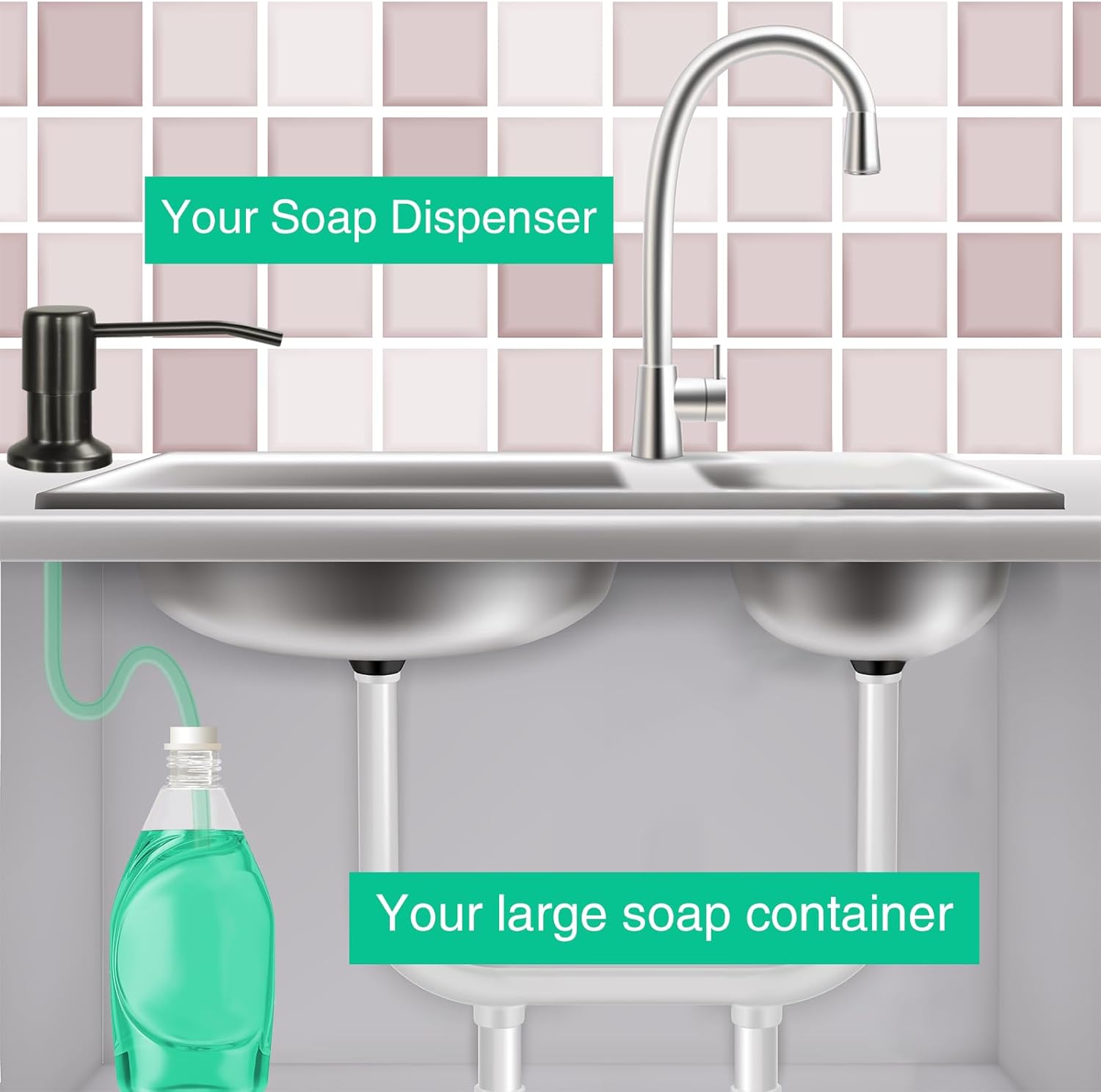 - No more messy refills - No more crawling under the sink. Our elegant sink soap dispenser comes with a 47” tube that goes directly into a large dish soap bottle, you can skip the frequent refill process.