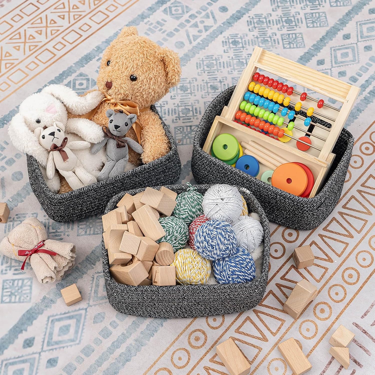 - Classy Natural Cotton Rope Storage Baskets-High quality well made. Very sturdy and a cute modern style. Durable woven rope, Long-lasting, skin-friendly, soft and attractive. You need these adorable baskets to put some supplies in, diaper, jewelry, cosmetics, makeup brushes, tea bags, storing smaller toys, toddler socks, candy